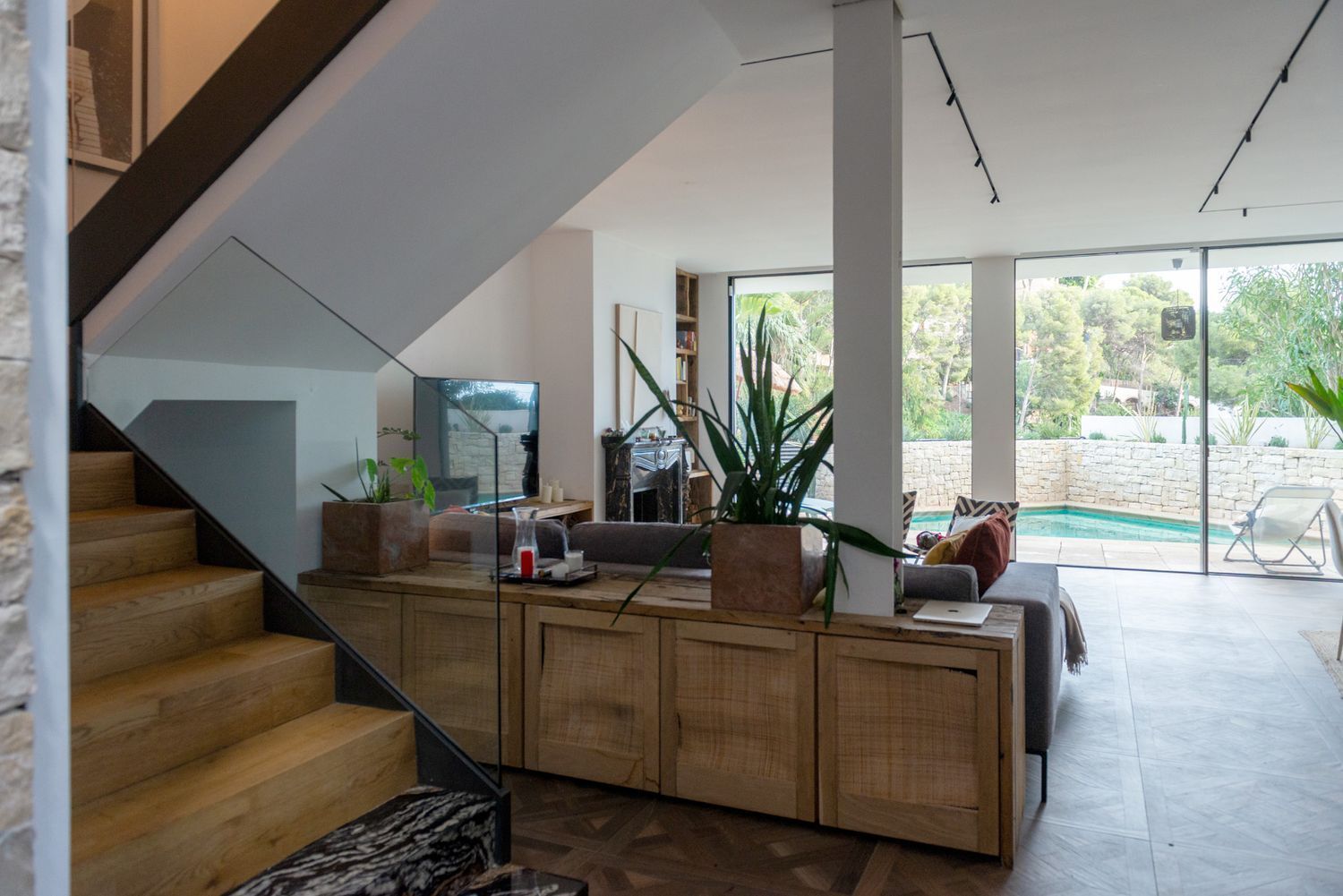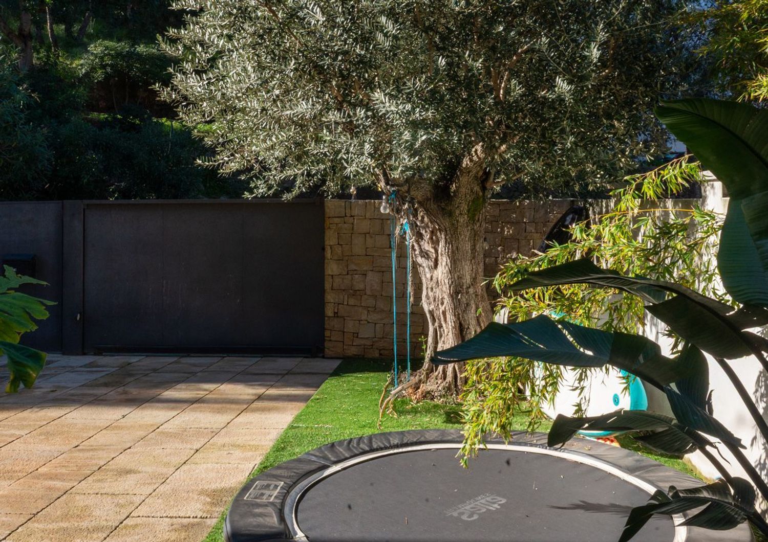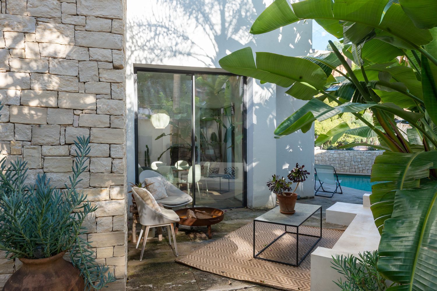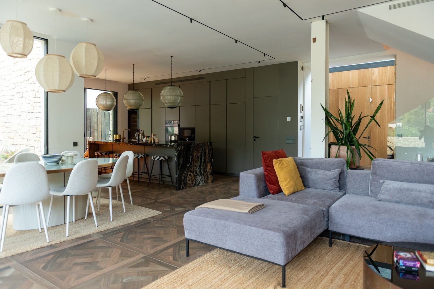 Outside, a Mediterranean garden with low maintenance surrounds the home, complemented by a heated saltwater pool and outdoor dining areas. The property enjoys total privacy thanks to the adjacent protected green area.