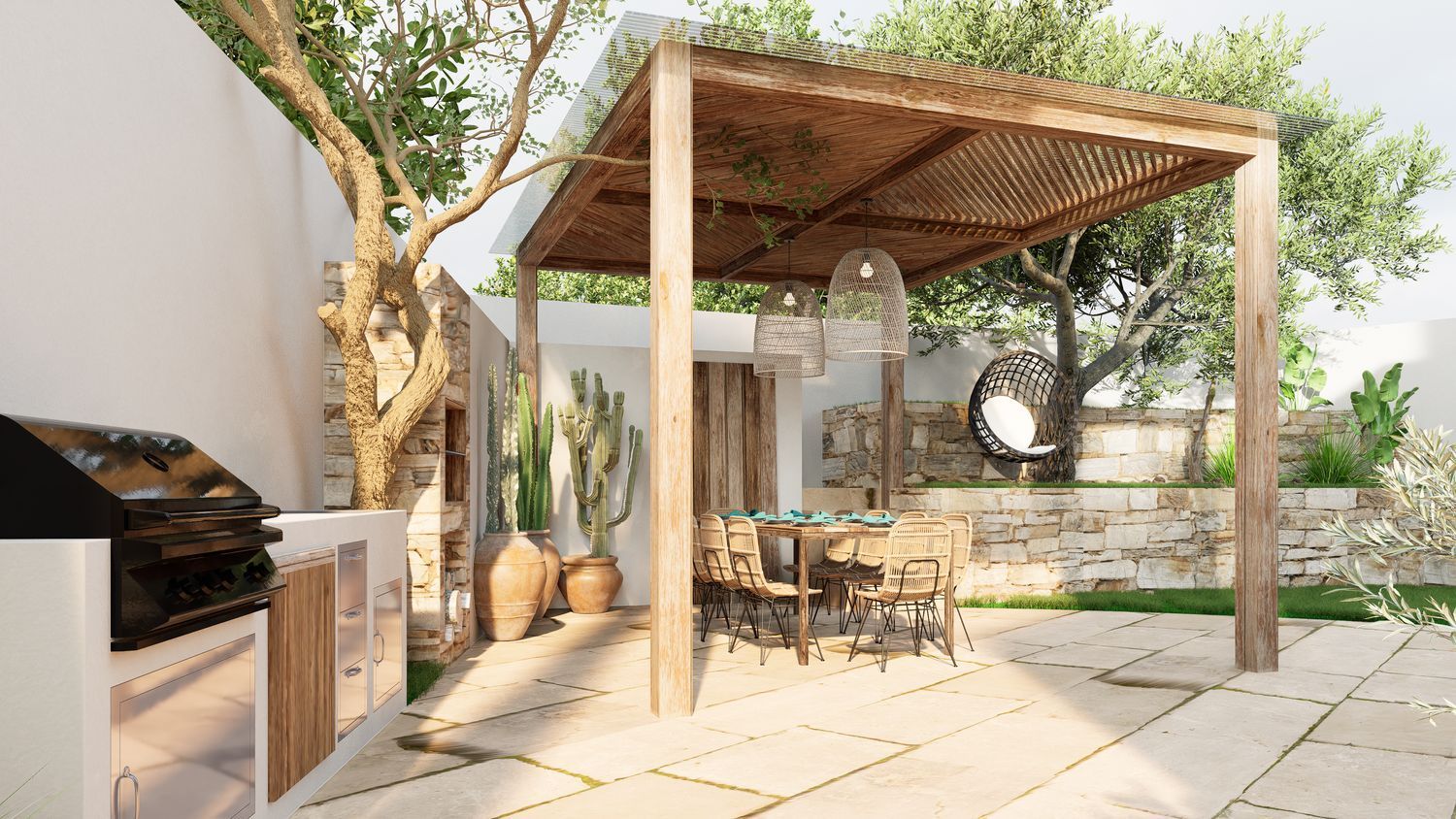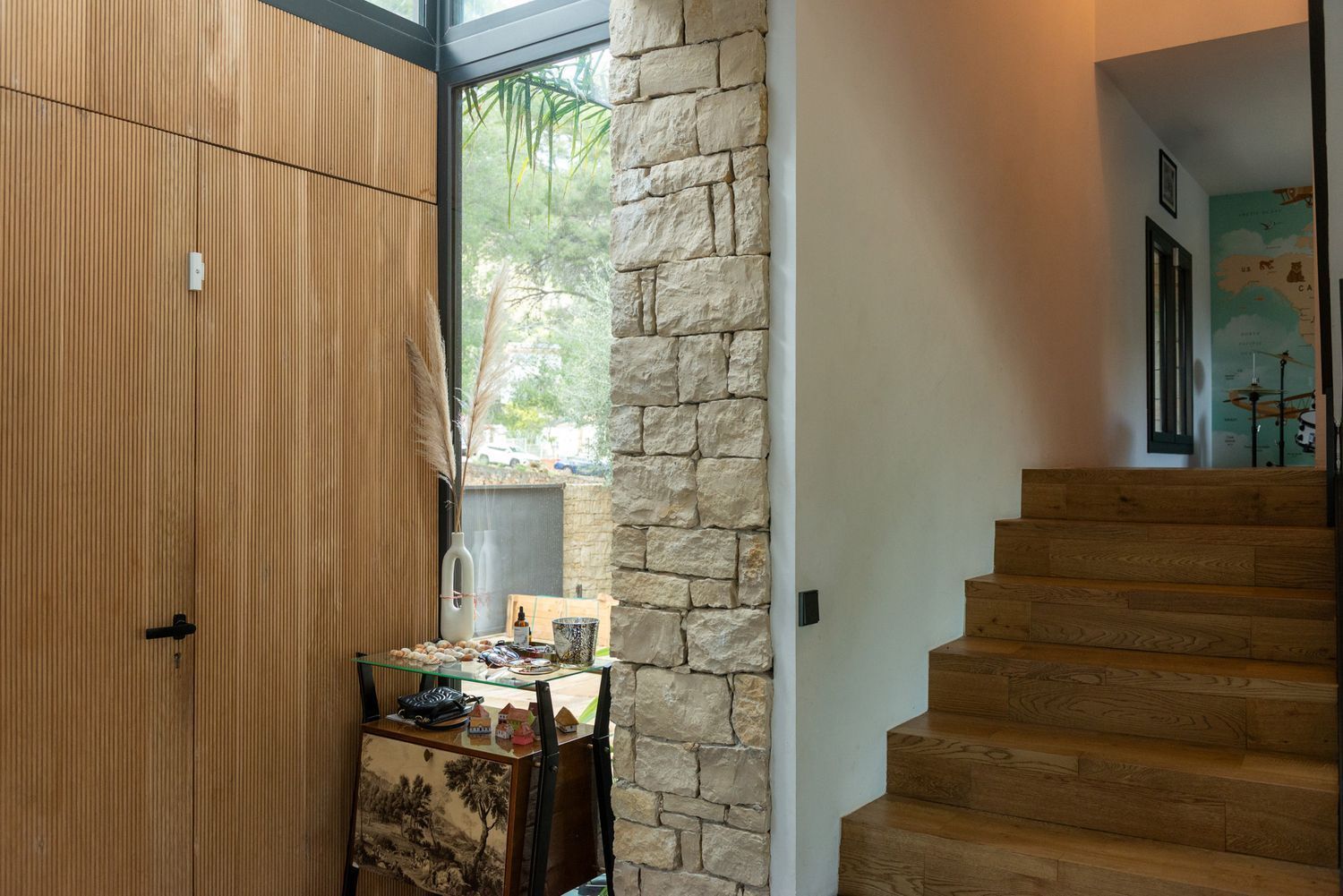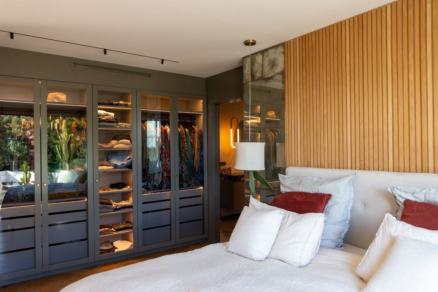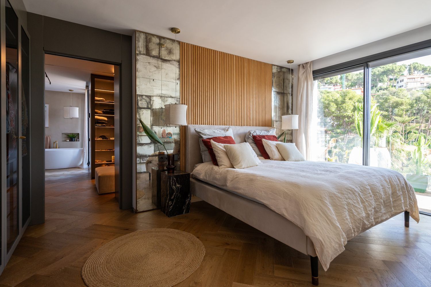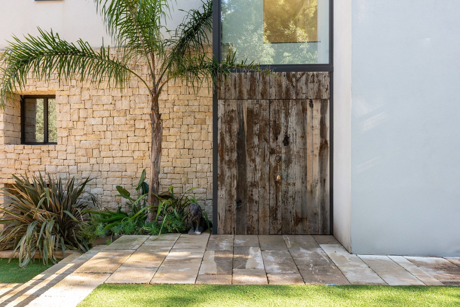 Outside, a Mediterranean garden with low maintenance surrounds the home, complemented by a heated saltwater pool and outdoor dining areas. The property enjoys total privacy thanks to the adjacent protected green area.