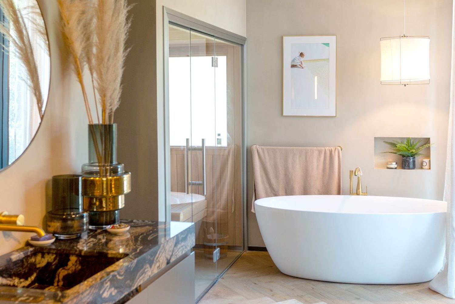 Upper floors host the sleeping areas, including a standout master suite with walk-in wardrobe, freestanding bathtub, and private sauna.