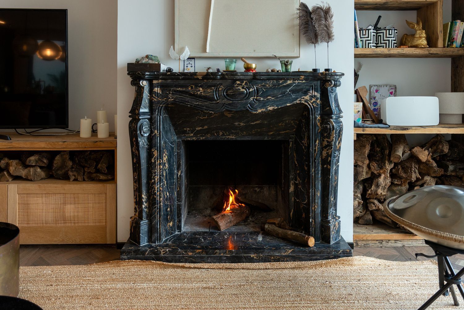 The home is distributed across several levels. The main floor features a spacious living and dining area with a fireplace and direct access to the garden, along with a large open-plan kitchen with a central island and high-end appliances.