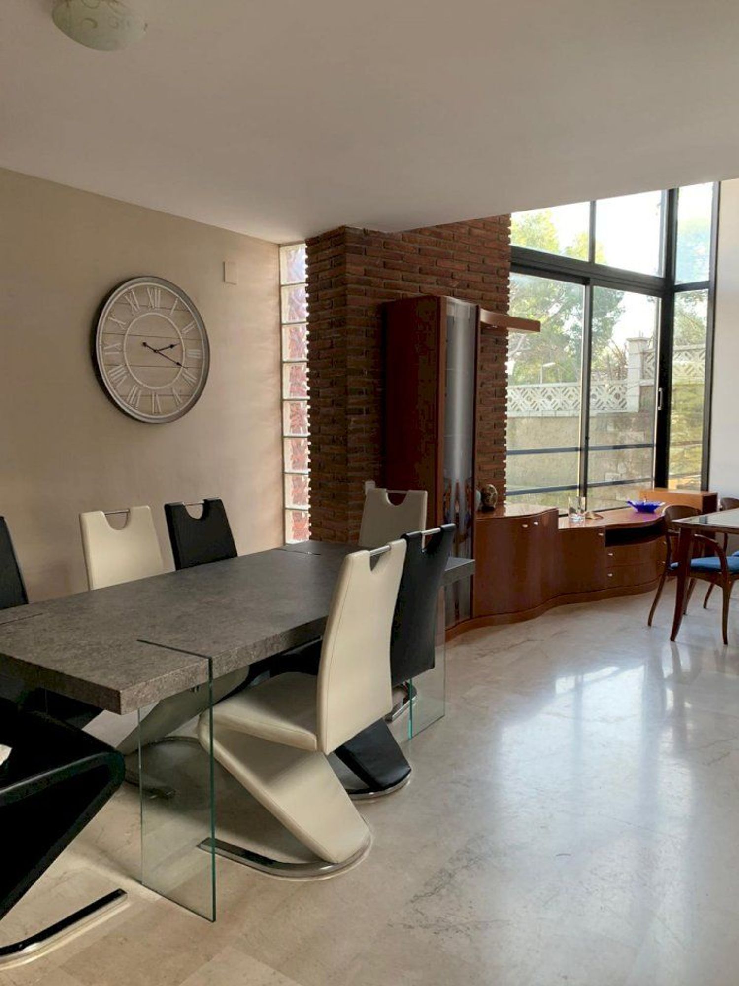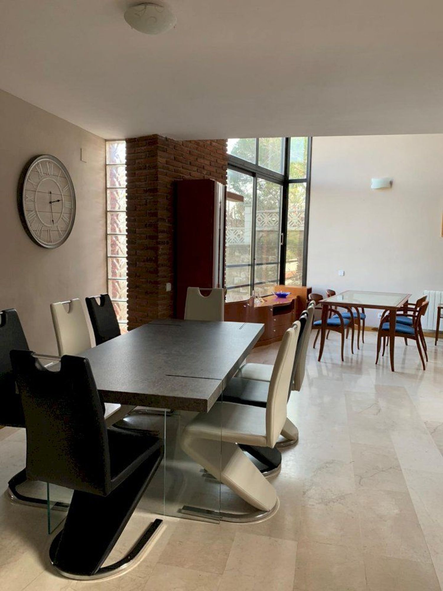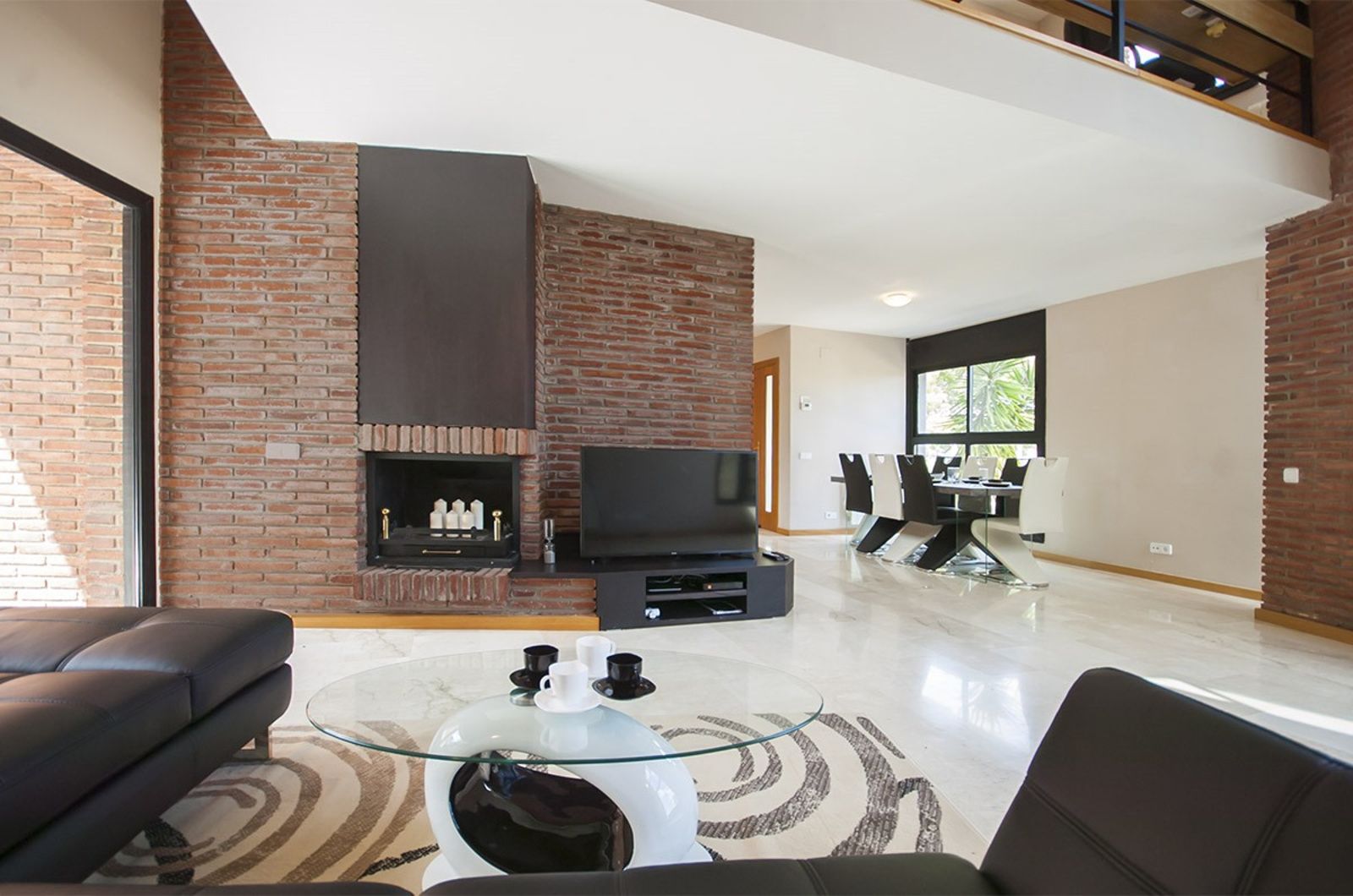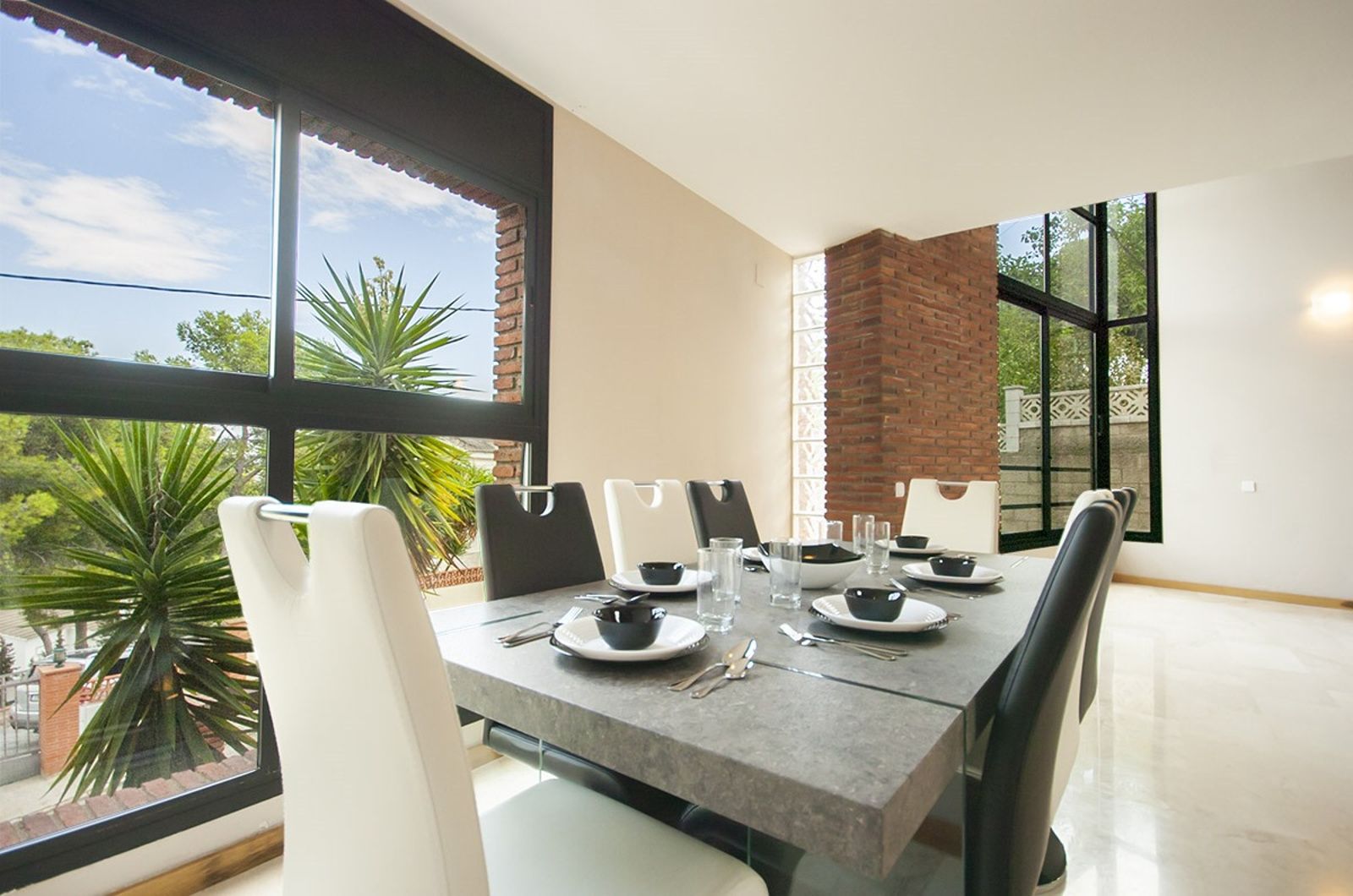 La proprietà offre una superficie totale di 332 m² con una distribuzione funzionale pensata per la vita familiare. Il piano principale, di 108 m², presenta un ampio soggiorno con sala da pranzo in open space, grandi vetrate e soffitti a doppia altezza che garantiscono luce naturale durante tutto il giorno. La cucina indipendente, completamente attrezzata, ha accesso diretto alla terrazza e alla zona barbecue. Su questo stesso livello si trovano una camera da letto e un bagno completo.