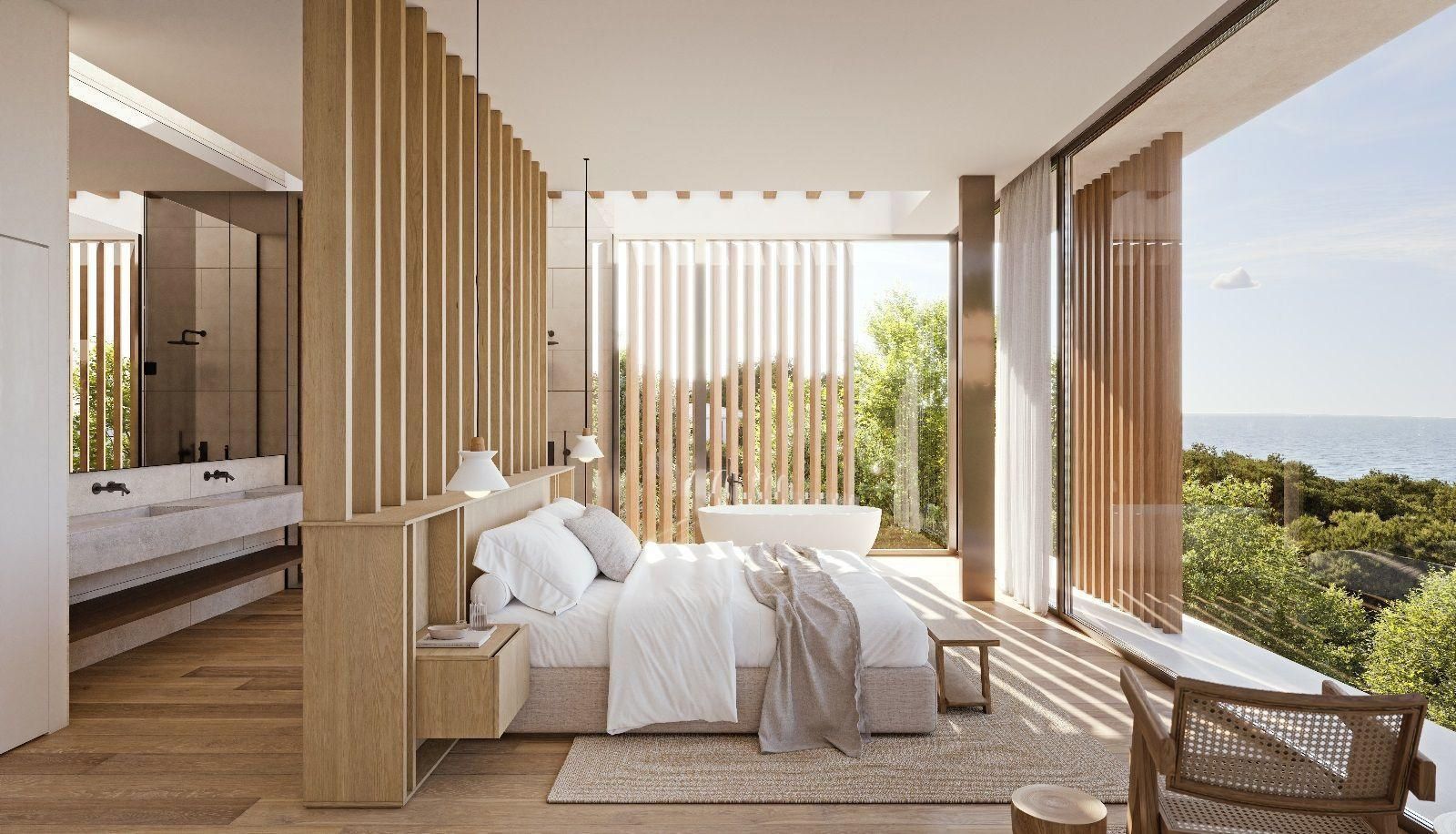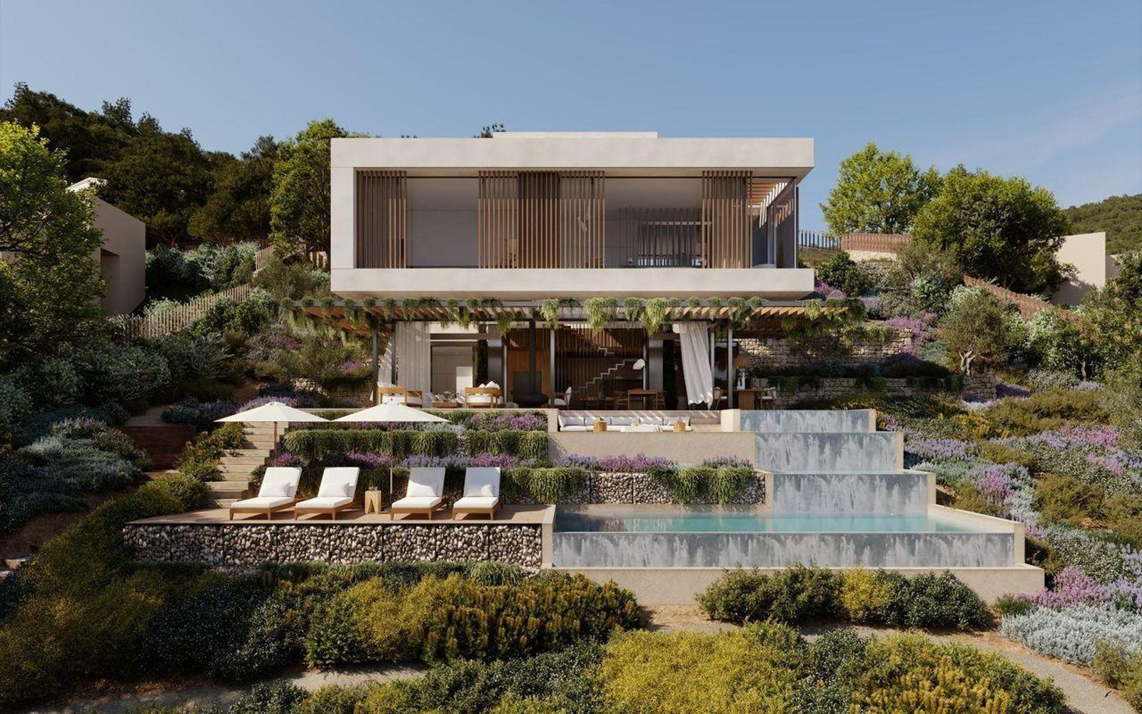 La villa presenta un’architettura contemporanea elegante e senza tempo, con particolare attenzione all’ampiezza degli spazi, alla privacy e al continuo dialogo con l’ambiente mediterraneo. Le principali zone giorno si aprono verso l’esterno grazie a grandi vetrate, offrendo viste panoramiche sul mare e sul paesaggio circostante.