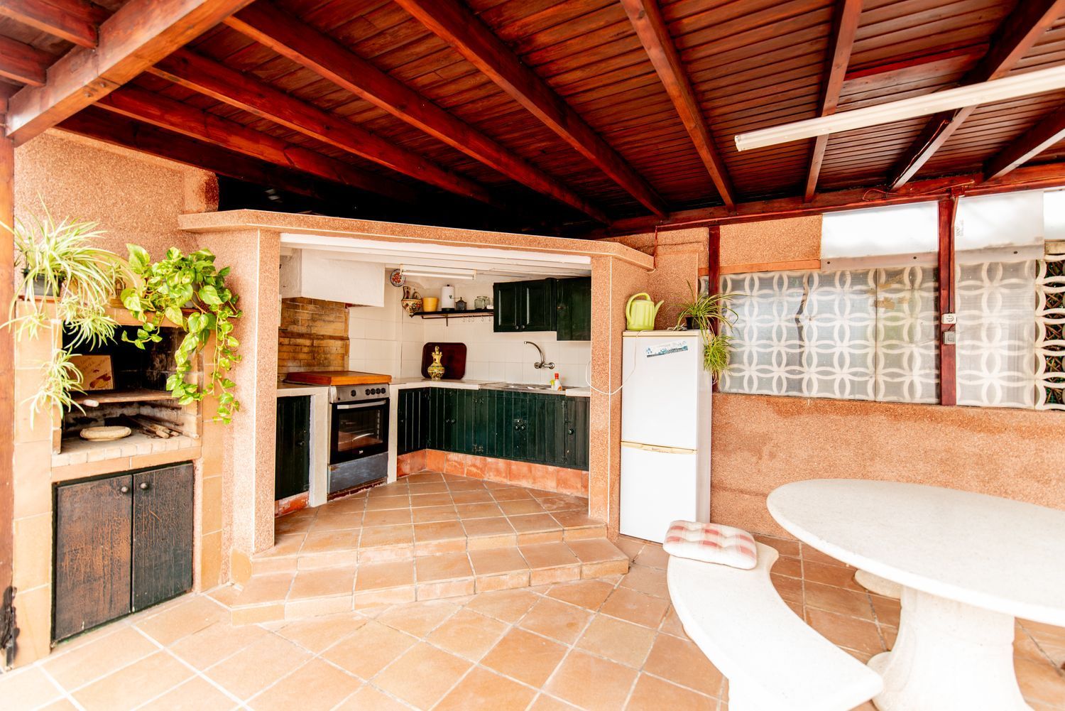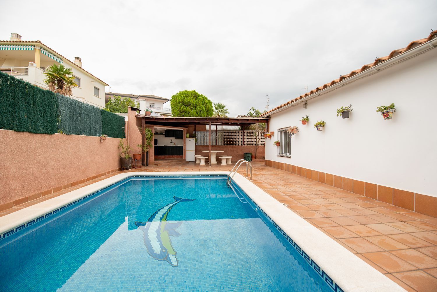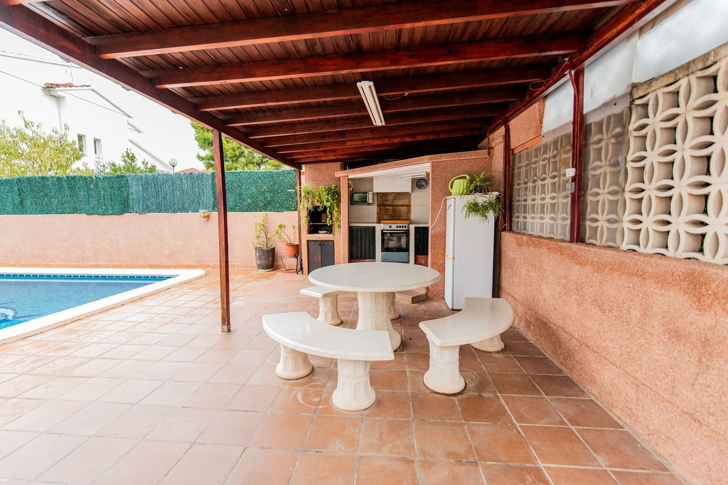 All’esterno troviamo un portico con cucina esterna e una piscina privata.