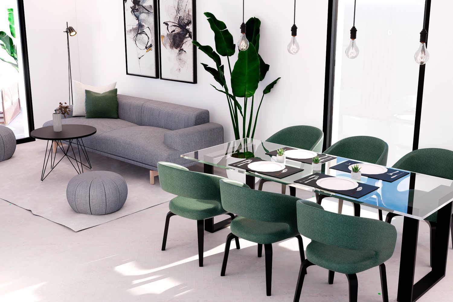Åpen planløsning med integrert kjøkken skaper lyse og romslige oppholdsrom, forsterket av store vindusflater.