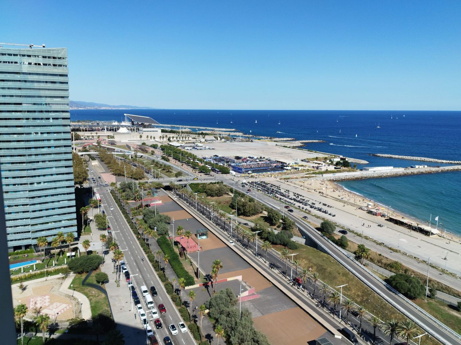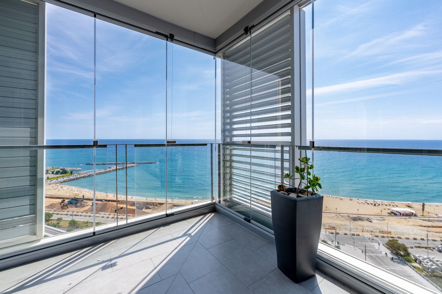 Den generøse terrassen på 80 m² omgir leiligheten og gir uendelig utsikt over Middelhavet og Barcelona, et perfekt sted å slappe av og nyte solnedgangen.