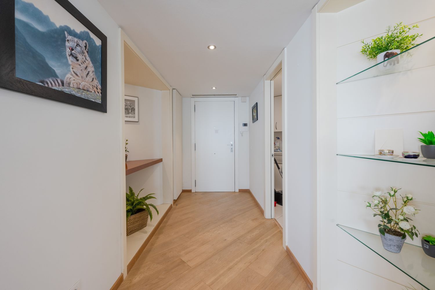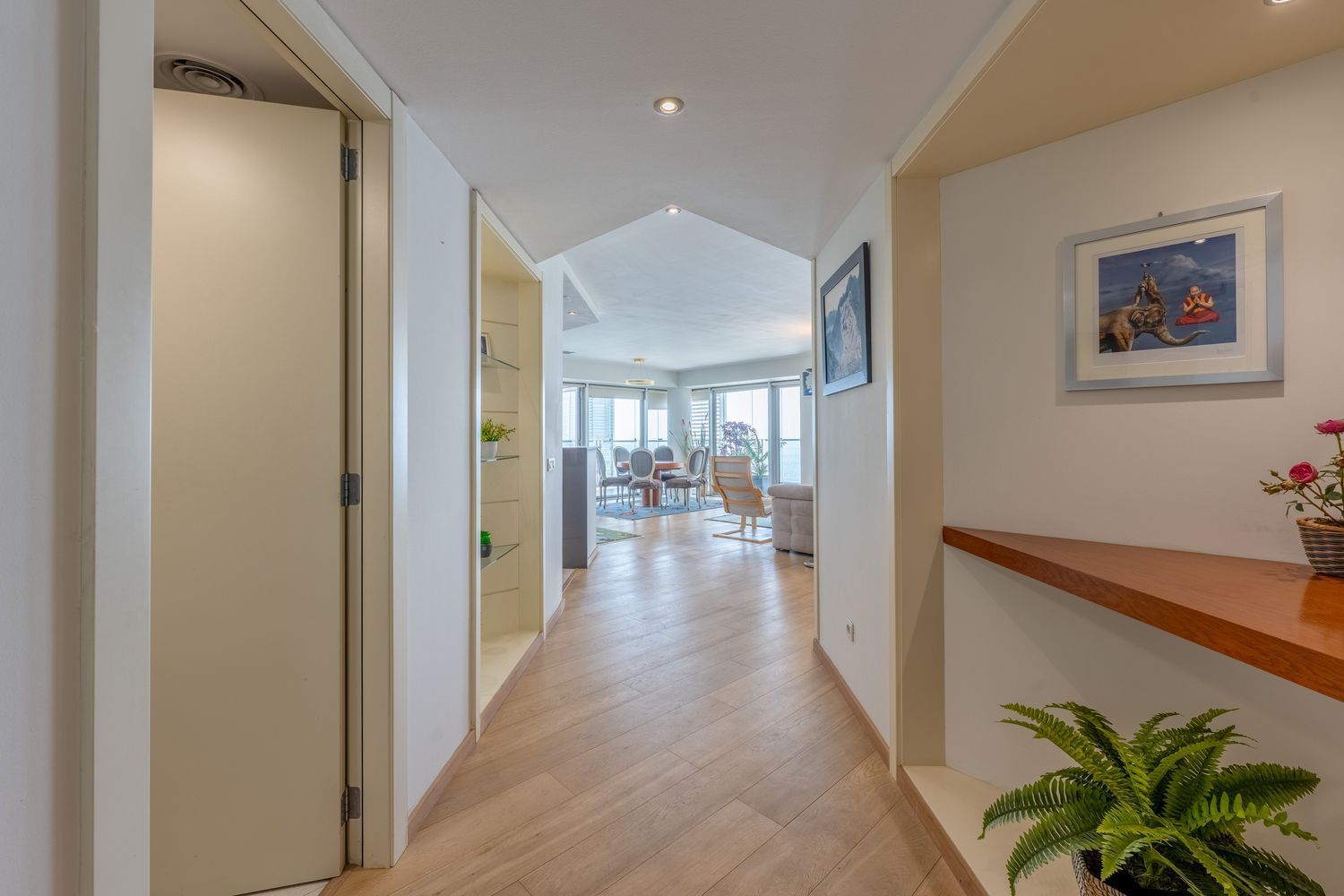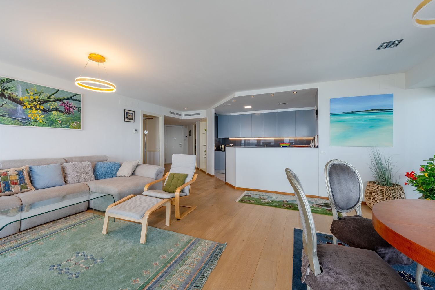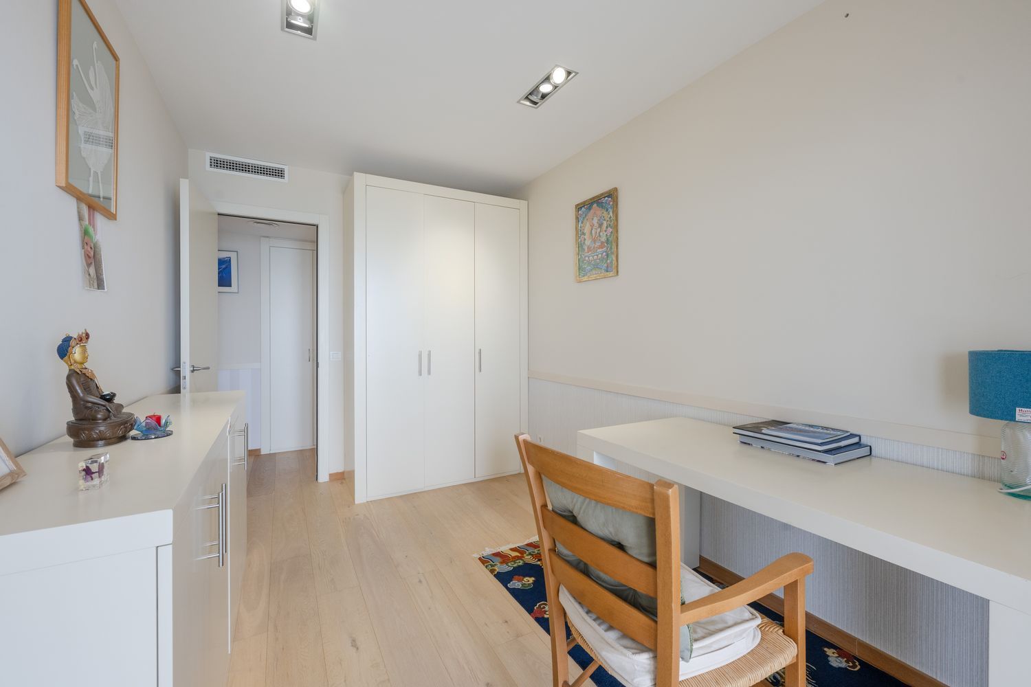 Leiligheten har også innebygde skap og effektiv klimaanlegg, som gir et praktisk hjem med rikelig lagringsplass.
