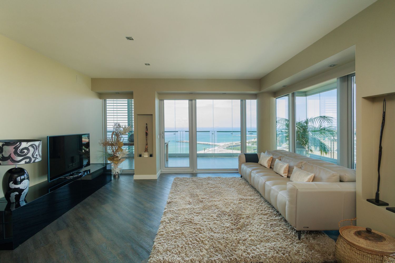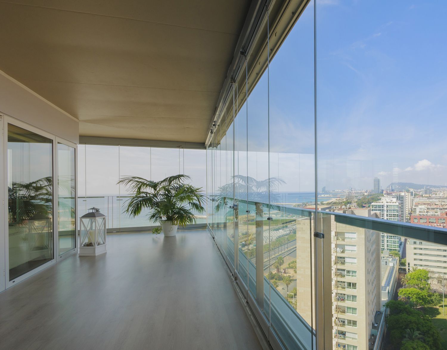 Den imponerende hjørneterrassen på 75 m², tilgjengelig fra alle rom og utstyrt med Lumon sammenleggbare glassvegger, skaper en sømløs forbindelse mellom innendørs og utendørs områder, og gir et lyst, åpent og elegant rom med panoramautsikt over sjøen og byen.