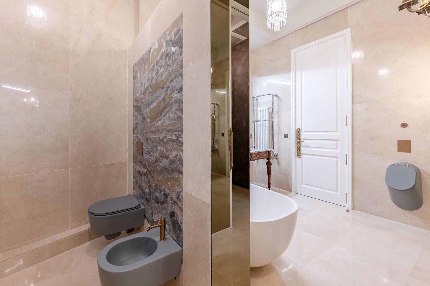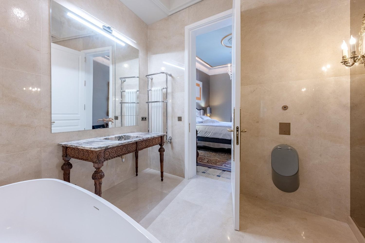 Den har tre soverom, to oppholdsrom og fire bad —to av dem en suite—, alle utformet med en nesten museumslignende finesse. Over 300 meter vegger er kledd i håndlaget fransk silke; et håndverk som bare to mestere behersker i hele Catalonia. Denne polstringen gir ikke bare sofistikasjon, men fungerer også som lydabsorpsjon og sikrer total privathet. Trekarmer med dobbelt glass gir full isolasjon mot utsiden.