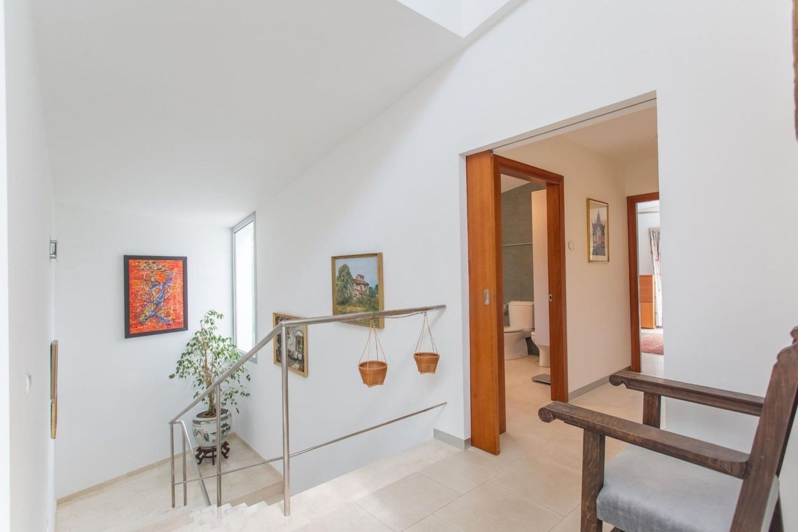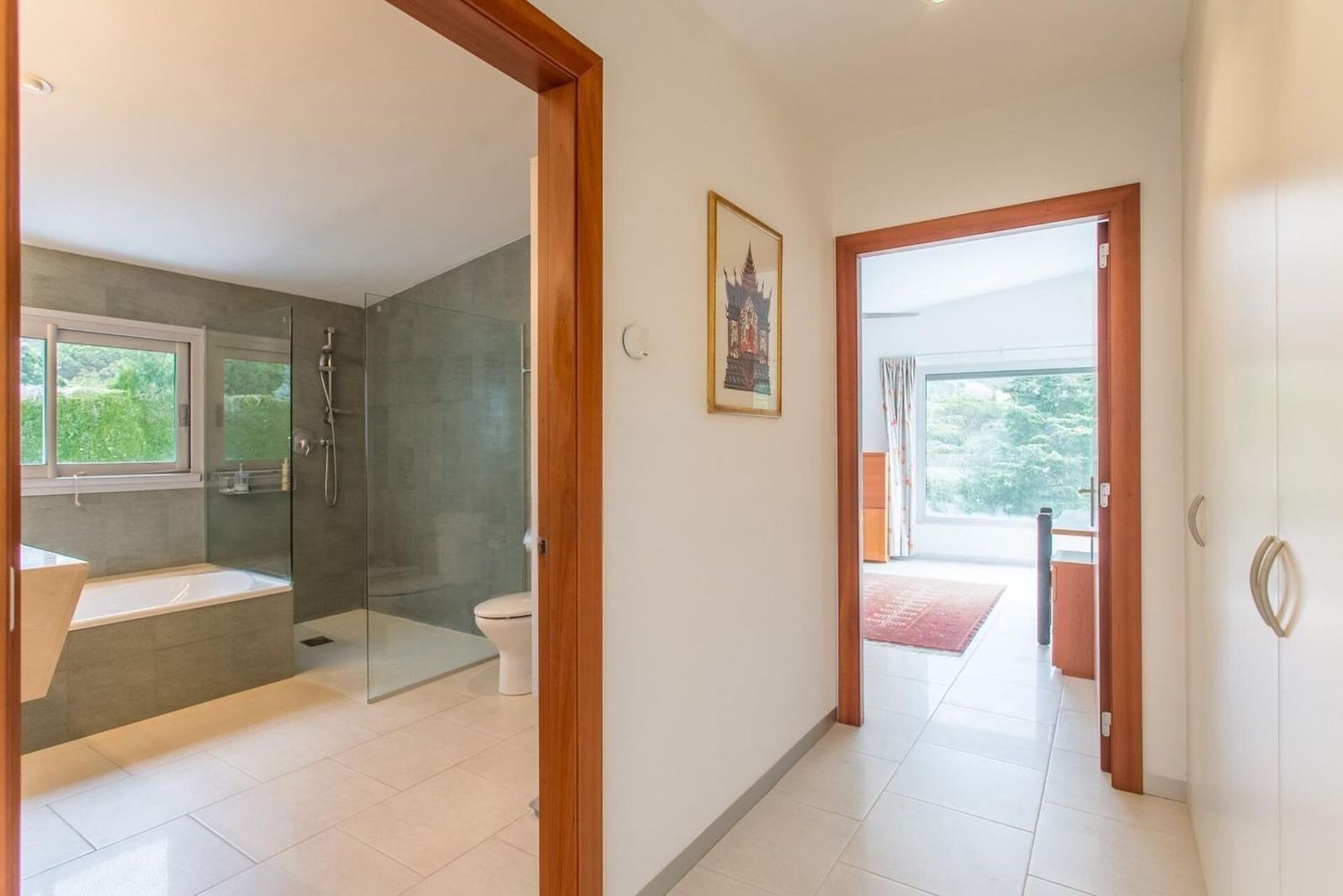 Hovedsuiten ligger på samme plan og inkluderer walk-in-garderobe og komplett bad med både dusj og badekar, noe som sikrer privatliv, romslighet og høy komfort. På dette planet finnes også et kontor ideelt for hjemmekontor, gjestetoalett og vaskerom med egen inngang.