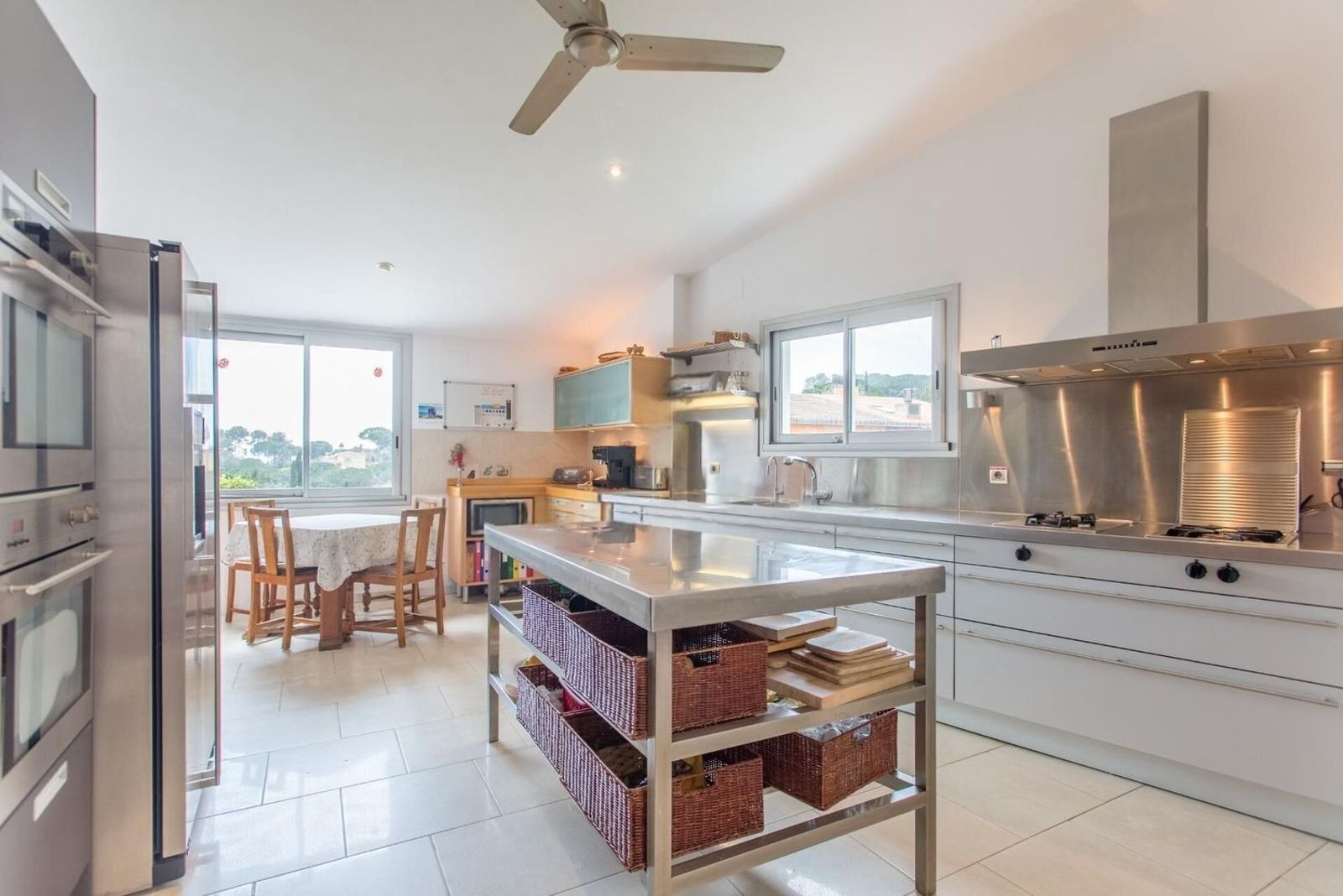 Kjøkkenet på 23 m² har kjøkkenøy og er fullt utstyrt med hvitevarer av høy kvalitet. Det er sømløst tilknyttet stue- og spisestue på 56 m², som har peis og store vindusflater med direkte utgang til den sørvendte terrassen med panoramautsikt over Middelhavet.