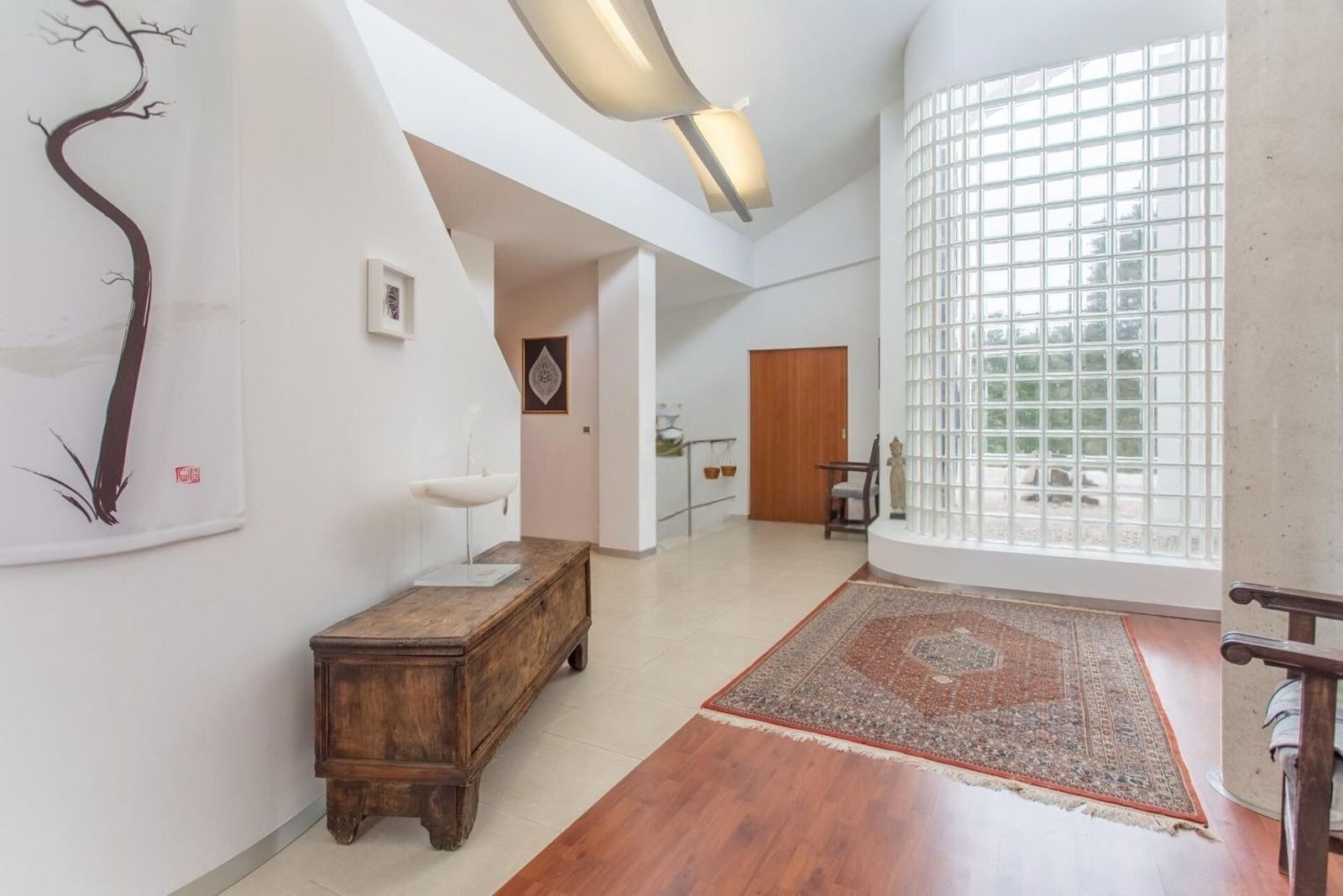 Ved ankomst imponerer eiendommen med en romslig entré på 24 m² med høye tak og en spektakulær glassfasade som slipper inn rikelig med naturlig lys og setter tonen for romslighet, design og eleganse gjennom hele boligen.