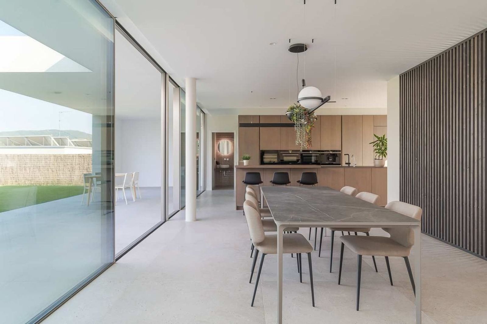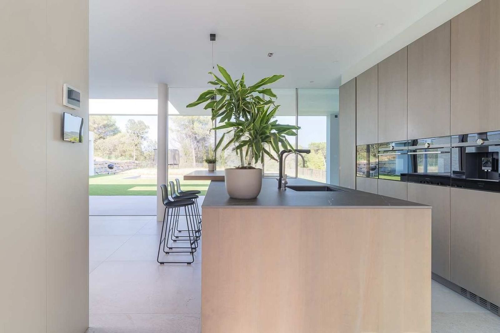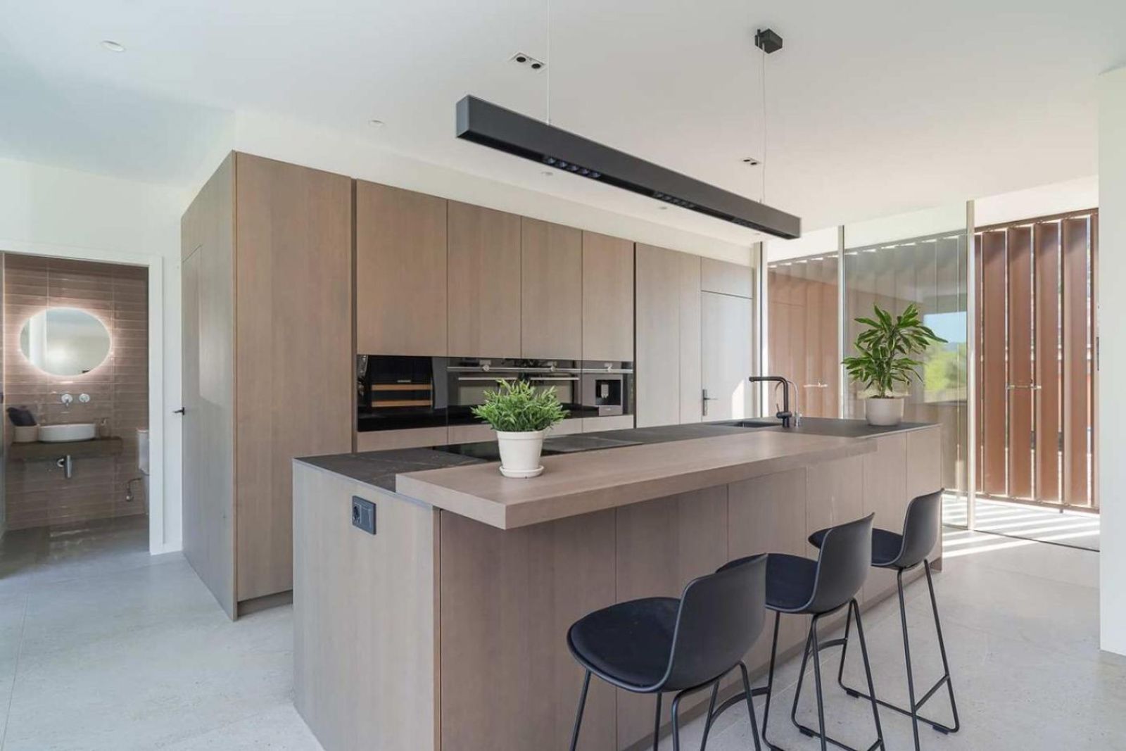 Det åpne kjøkkenet er utstyrt med kvalitetsapparater og er utformet for både funksjonell og sosial bruk. En separat, diskret integrert vaskeromsløsning ligger ved siden av. Et gjestetoalett og et hjemmekontor finnes også på dette planet.