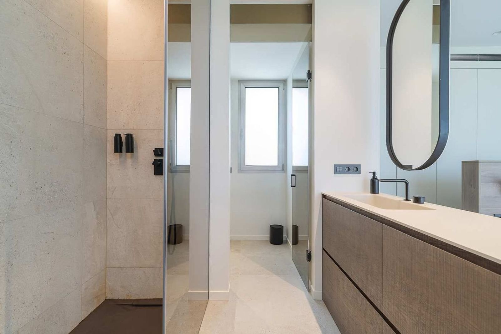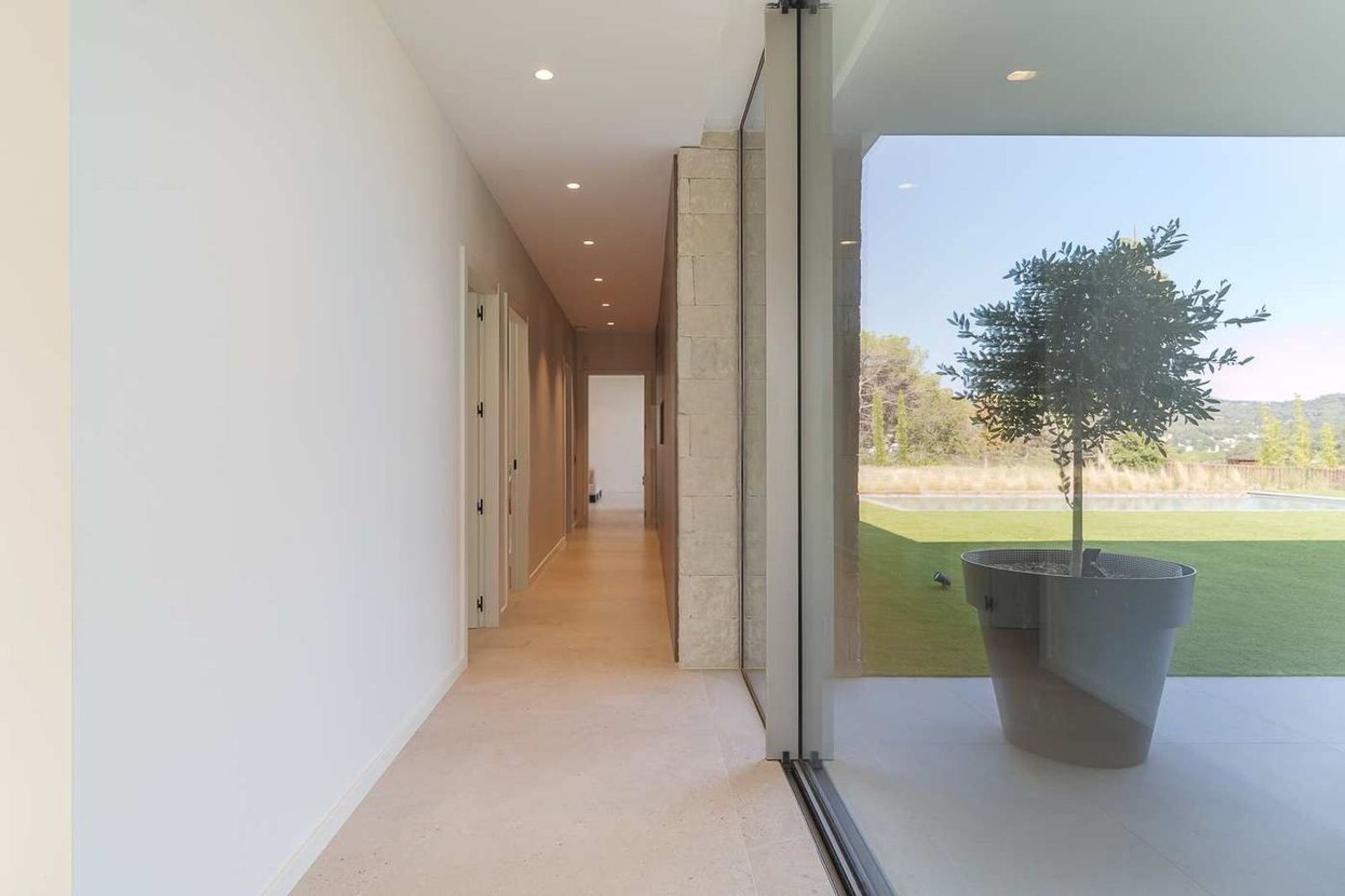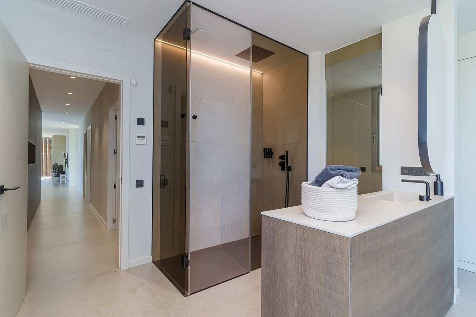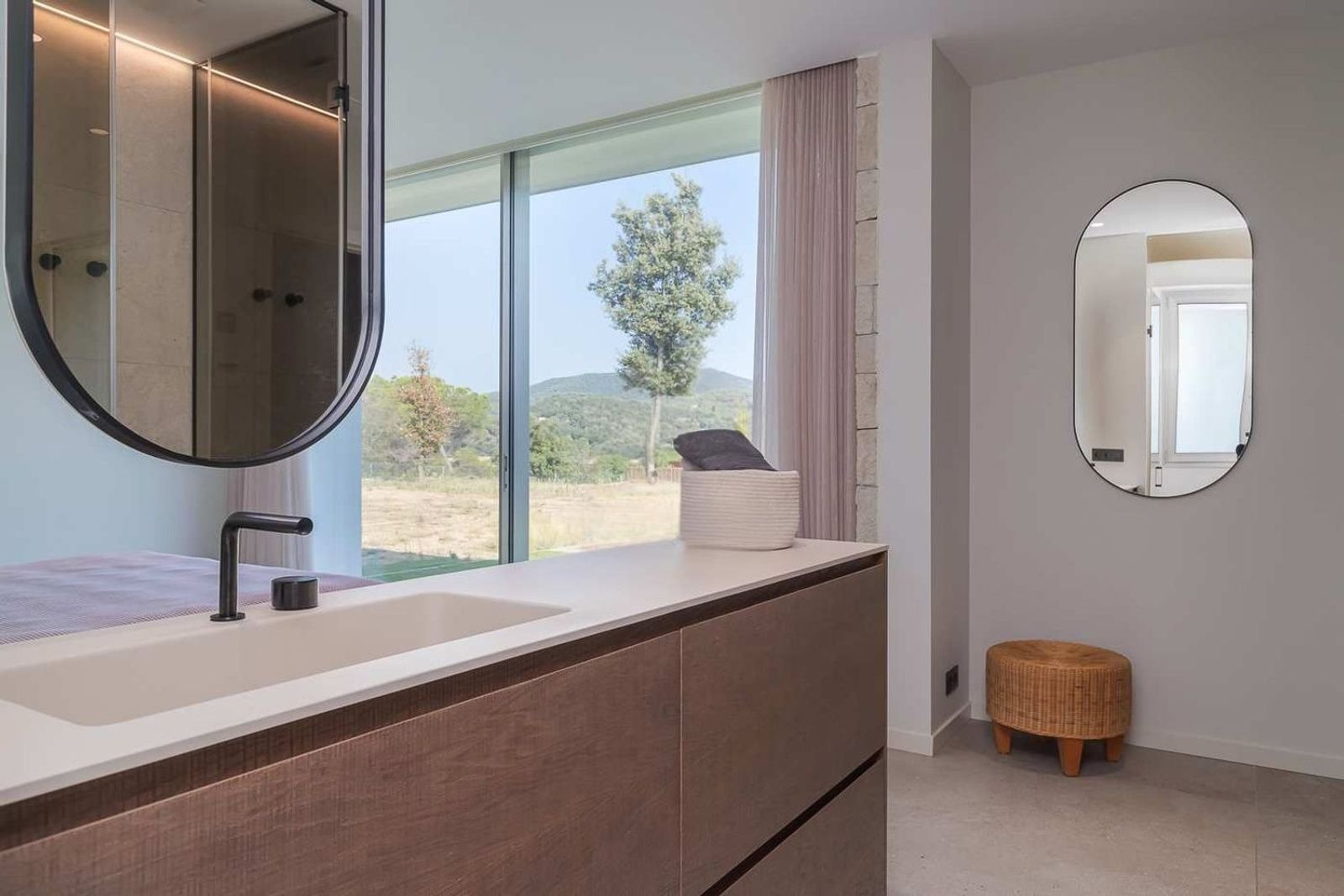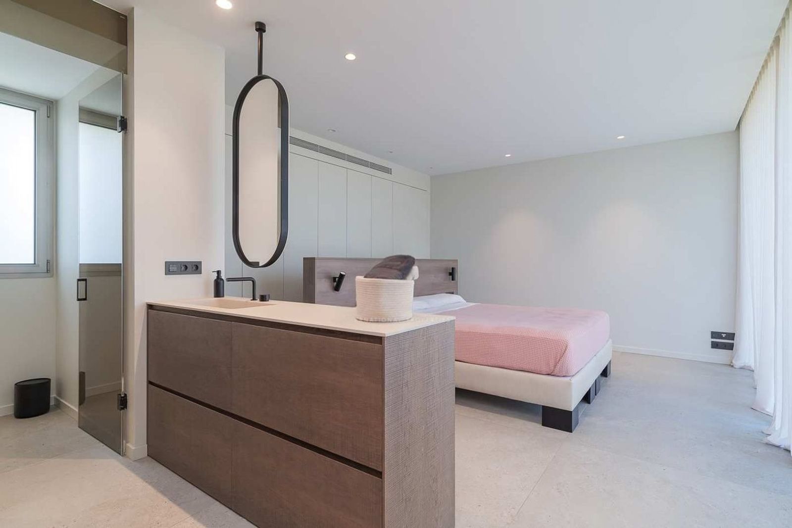 Soveavdelingen består av to romslige soverom med delt bad, samt et hovedsoverom utformet som et privat tilfluktssted, med eget bad og direkte utgang til hage og bassengområde.