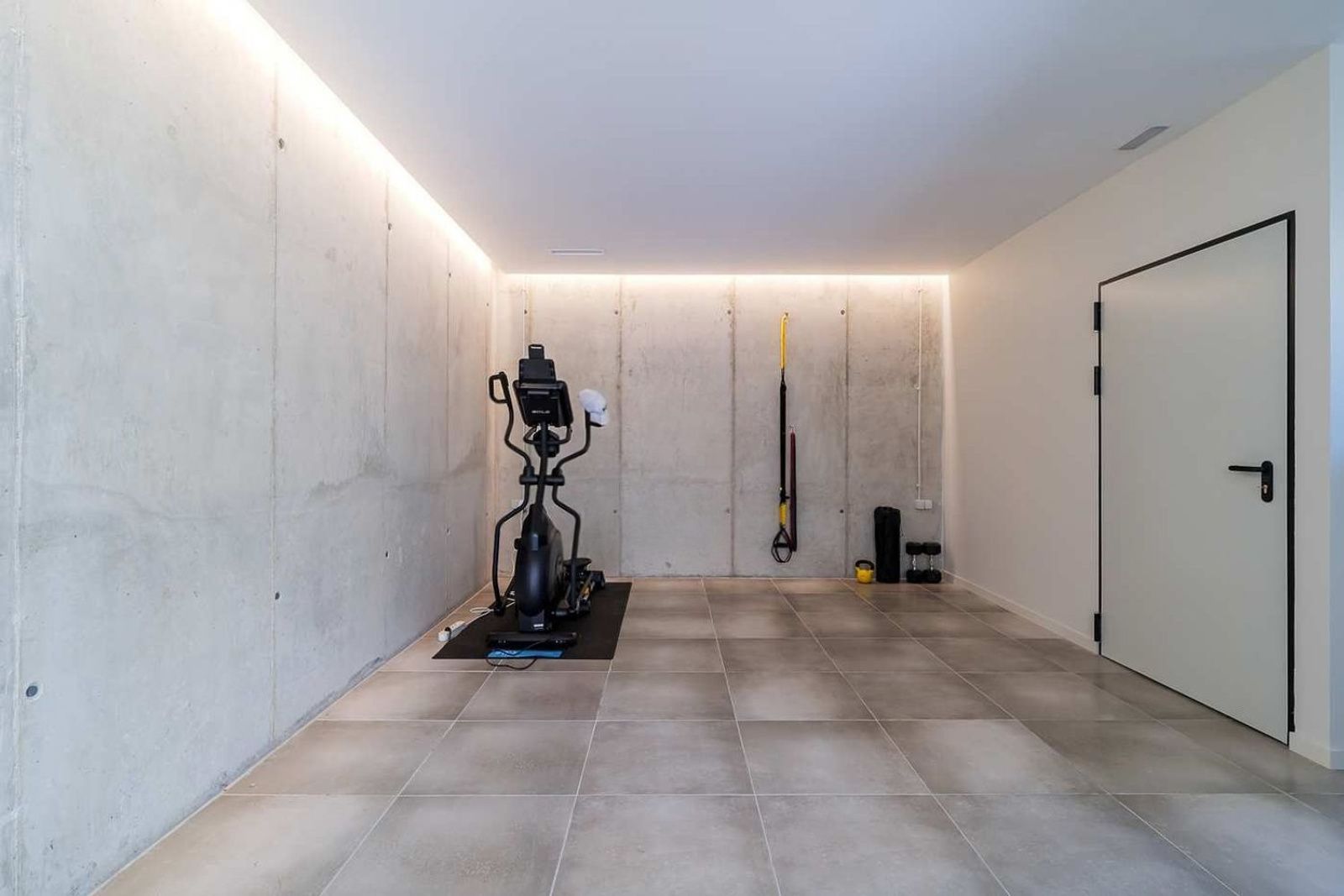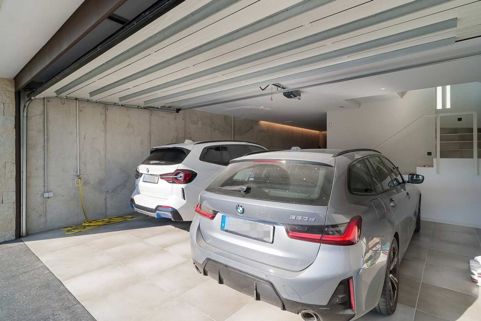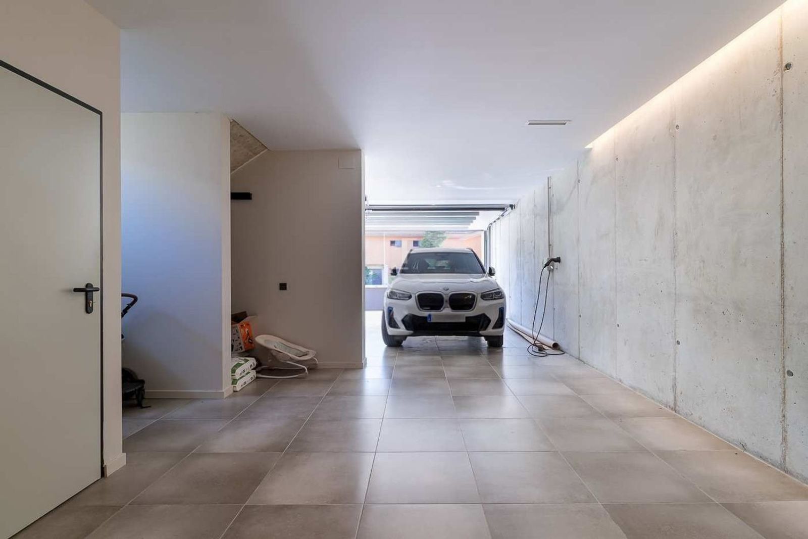 Kjelleretasjen gir ekstra funksjonalitet med garasje for tre biler, lagringsarealer og et teknisk rom som huser boligens avanserte systemer for effektiv og sentral styring.