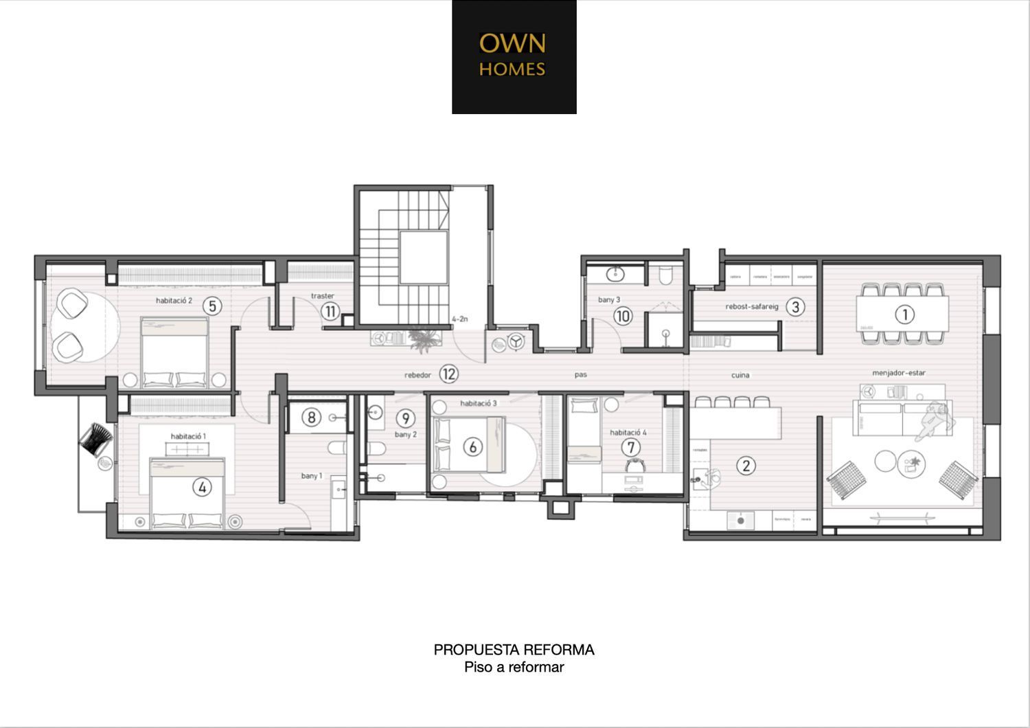 Bygningen bevarer den herskapelige stilen som kjennetegner Barcelonas klassiske eiendommer, mens interiørprosjektet introduserer en moderne og funksjonell planløsning tilpasset dagens krav til komfort.