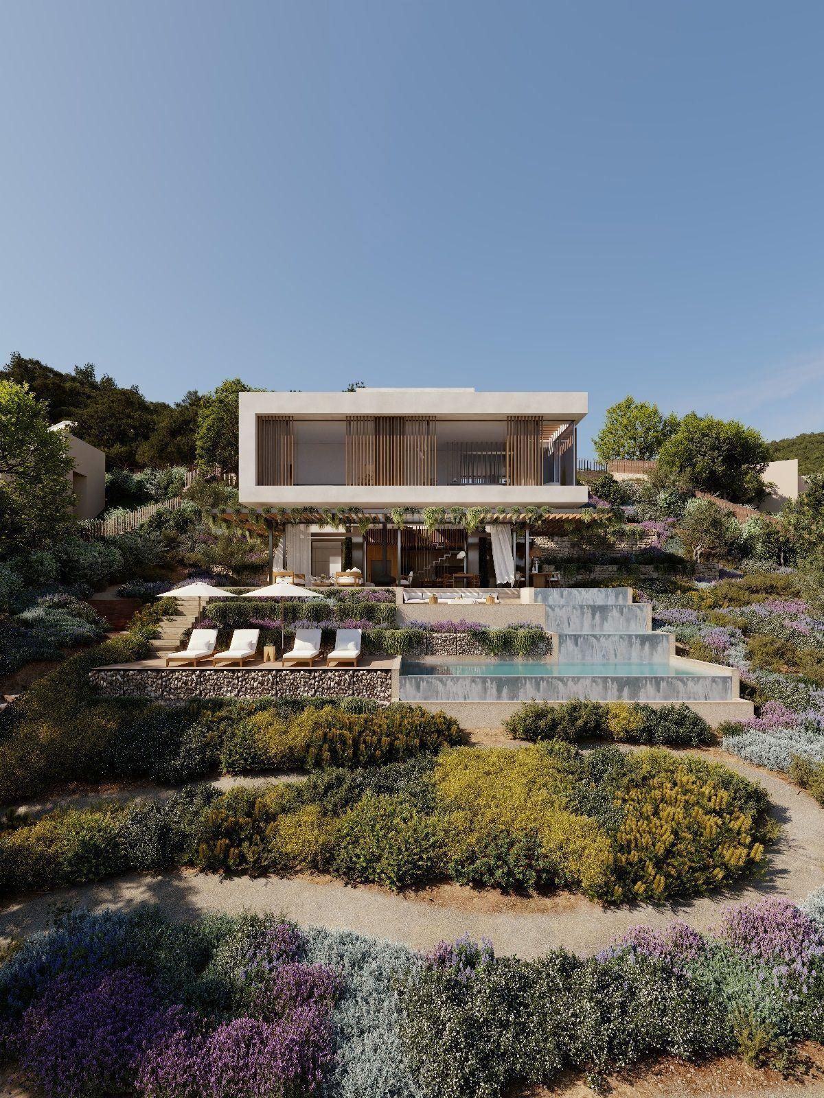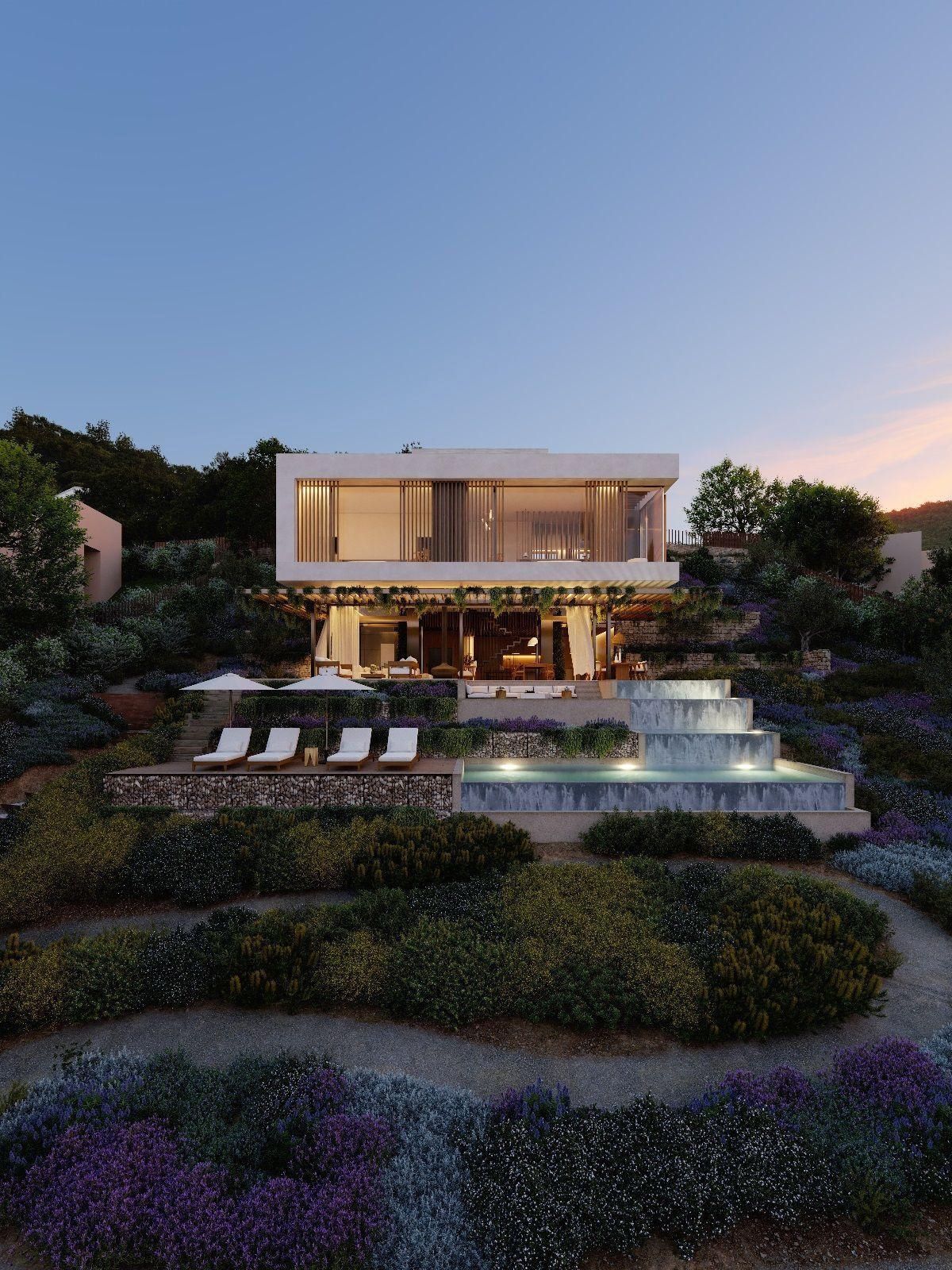 Boligen har en elegant og tidløs moderne arkitektur, med fokus på romslighet, privatliv og en kontinuerlig forbindelse med det mediterrane miljøet. Store vindusflater åpner hovedoppholdsrommene mot utsiden og gir panoramautsikt over havet og det omkringliggende landskapet.