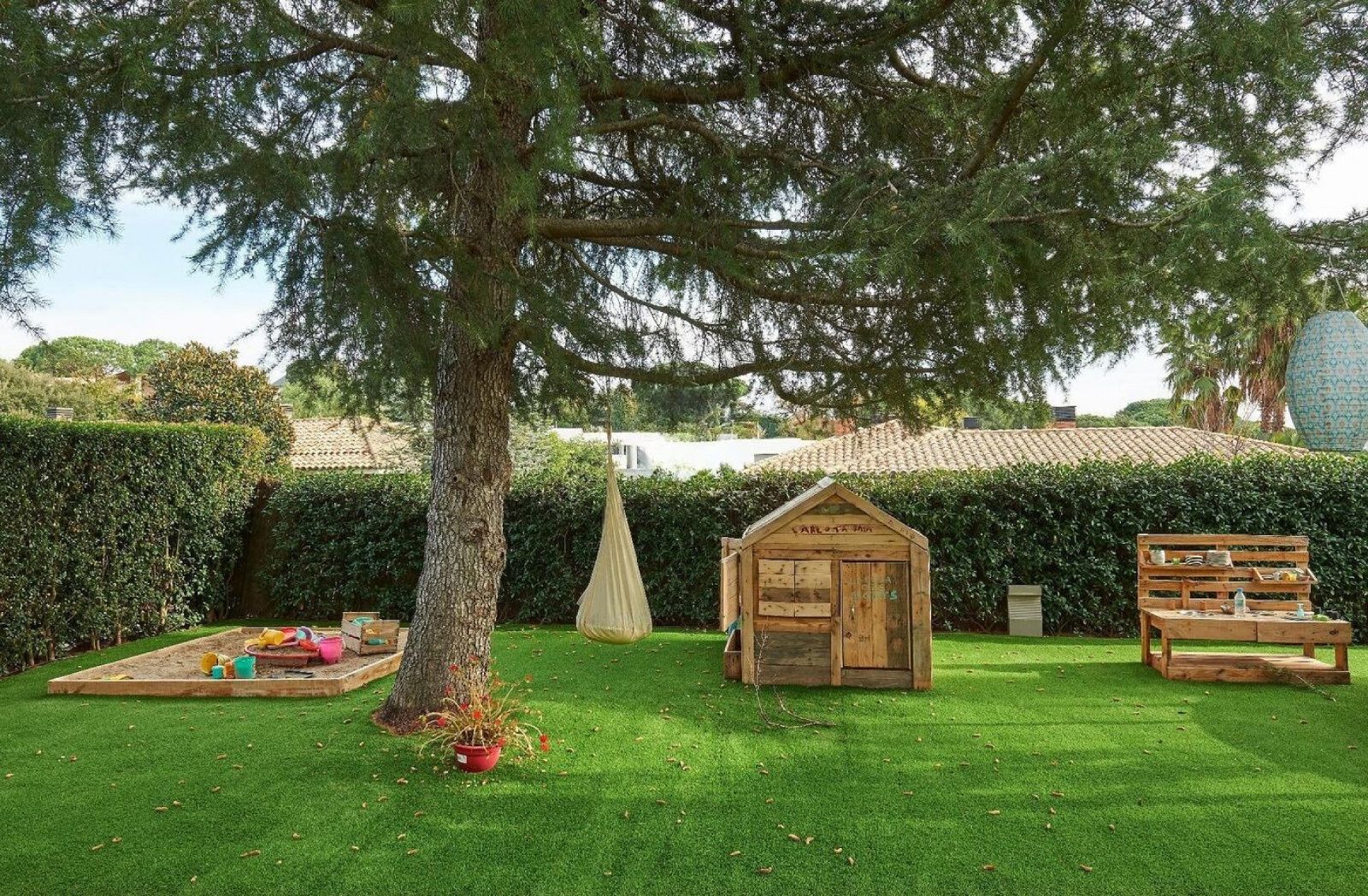 Uteområdene er nøye planlagt, med privat hage, overbygd terrasse med åpen utsikt og privat basseng, ideelt for avslapning og sosialt samvær.