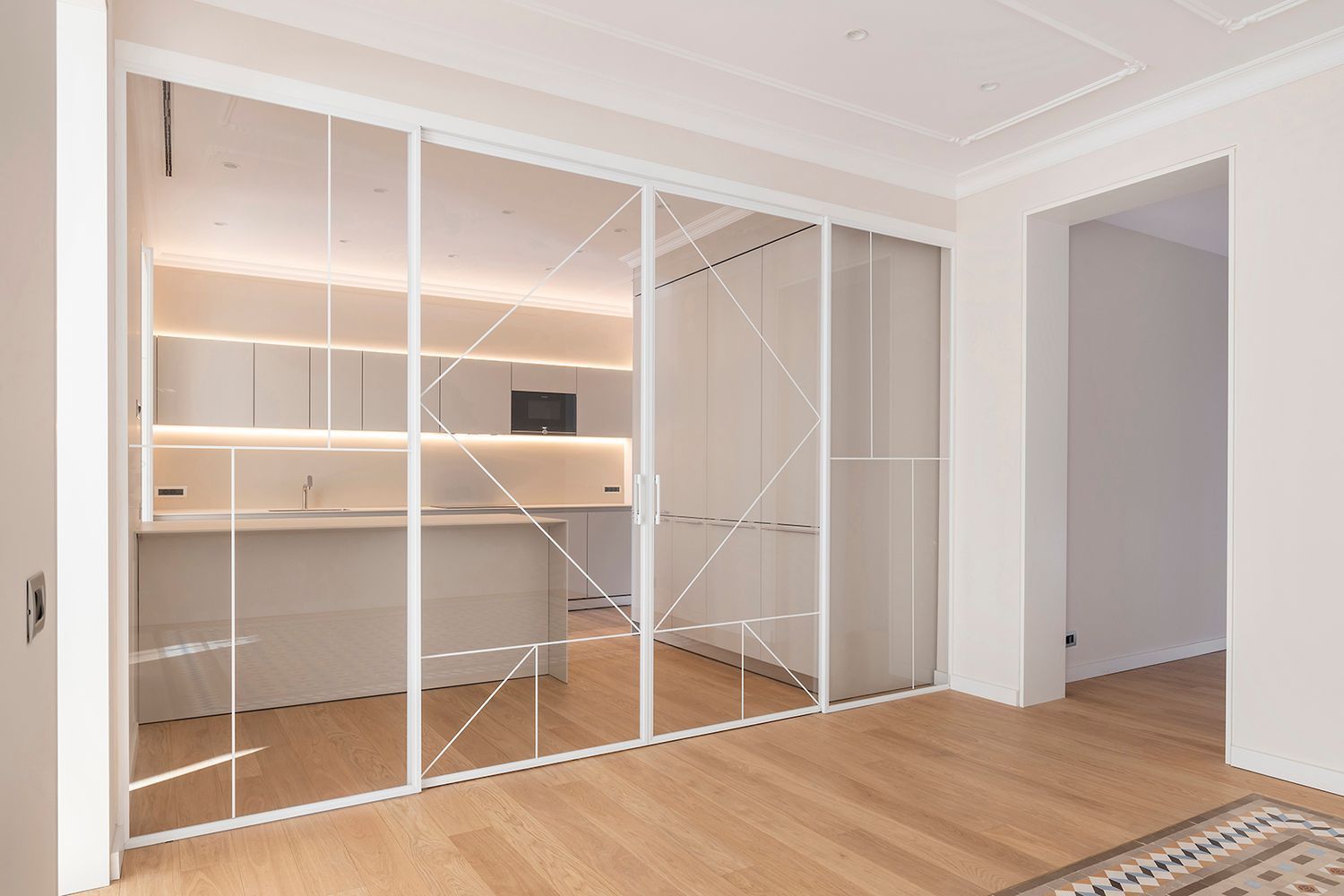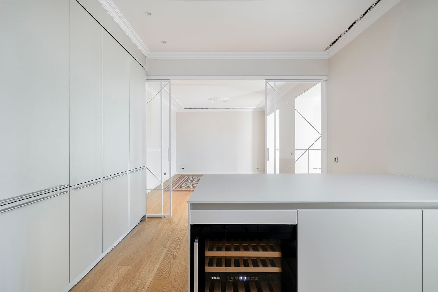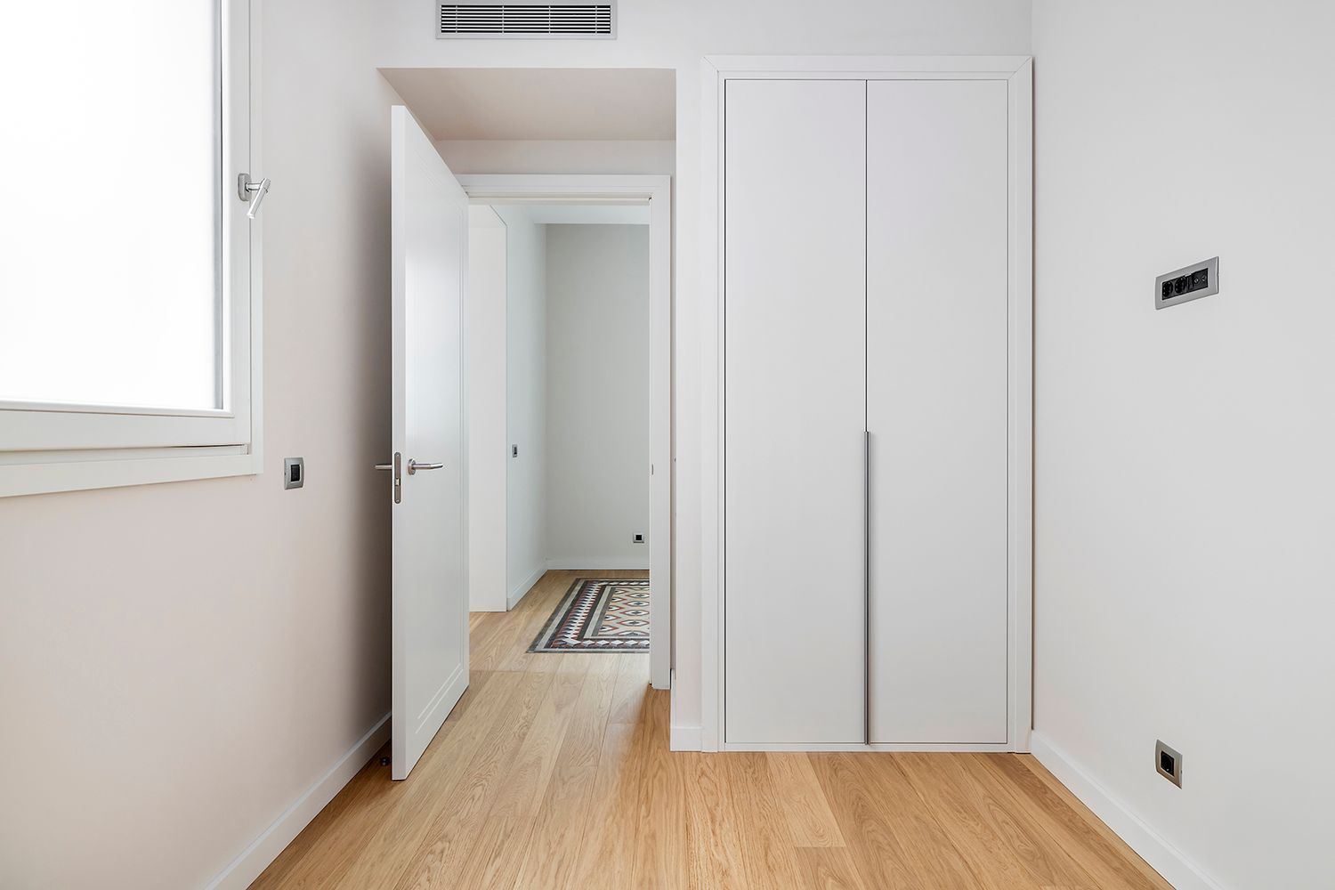 Planløsningen er moderne og harmonisk integrert i bygningens opprinnelige arkitektur. Oppholdsrommet består av en åpen løsning med stue, spiseplass og fullt integrert kjøkken, utformet som en naturlig del av boligen. Tre balkonger vendt mot sjøen gir direkte utsikt over Port Vell og Middelhavet.