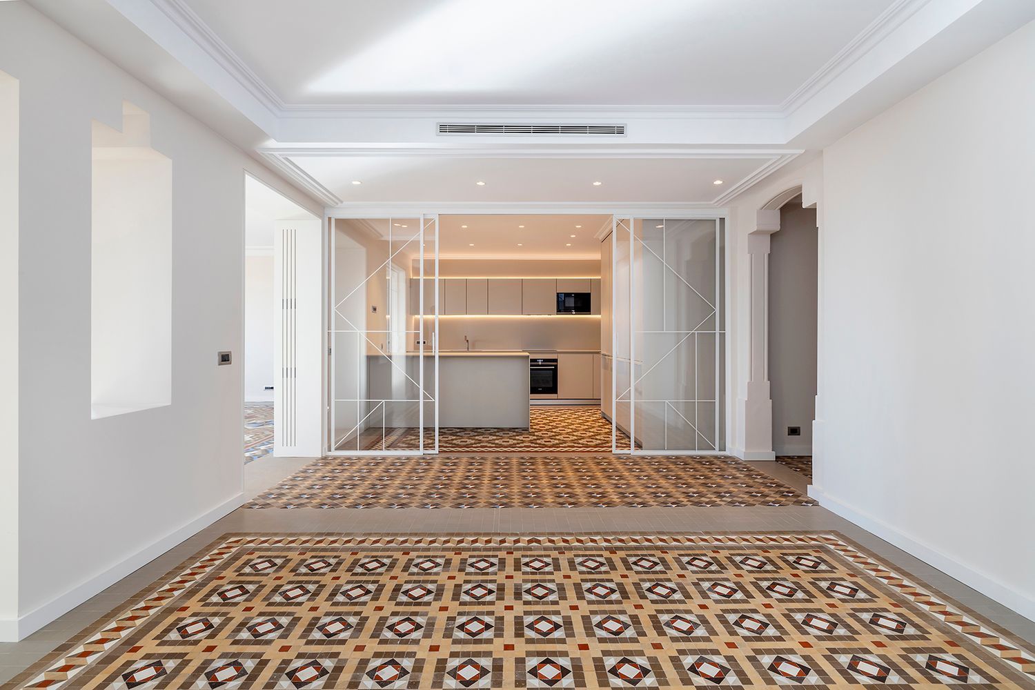 Den private delen består av tre soverom og to komplette bad. Interiøret kombinerer moderne materialer med bevarte originale detaljer som smijern og hydrauliske gulv. Moderne tekniske løsninger bidrar til et komfortabelt og effektivt innemiljø.
