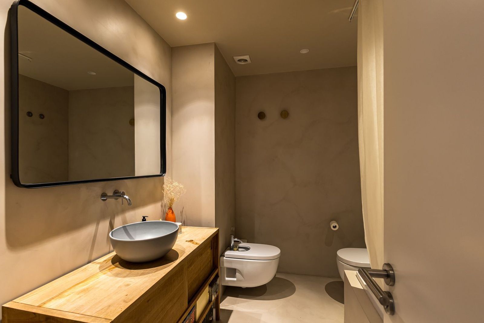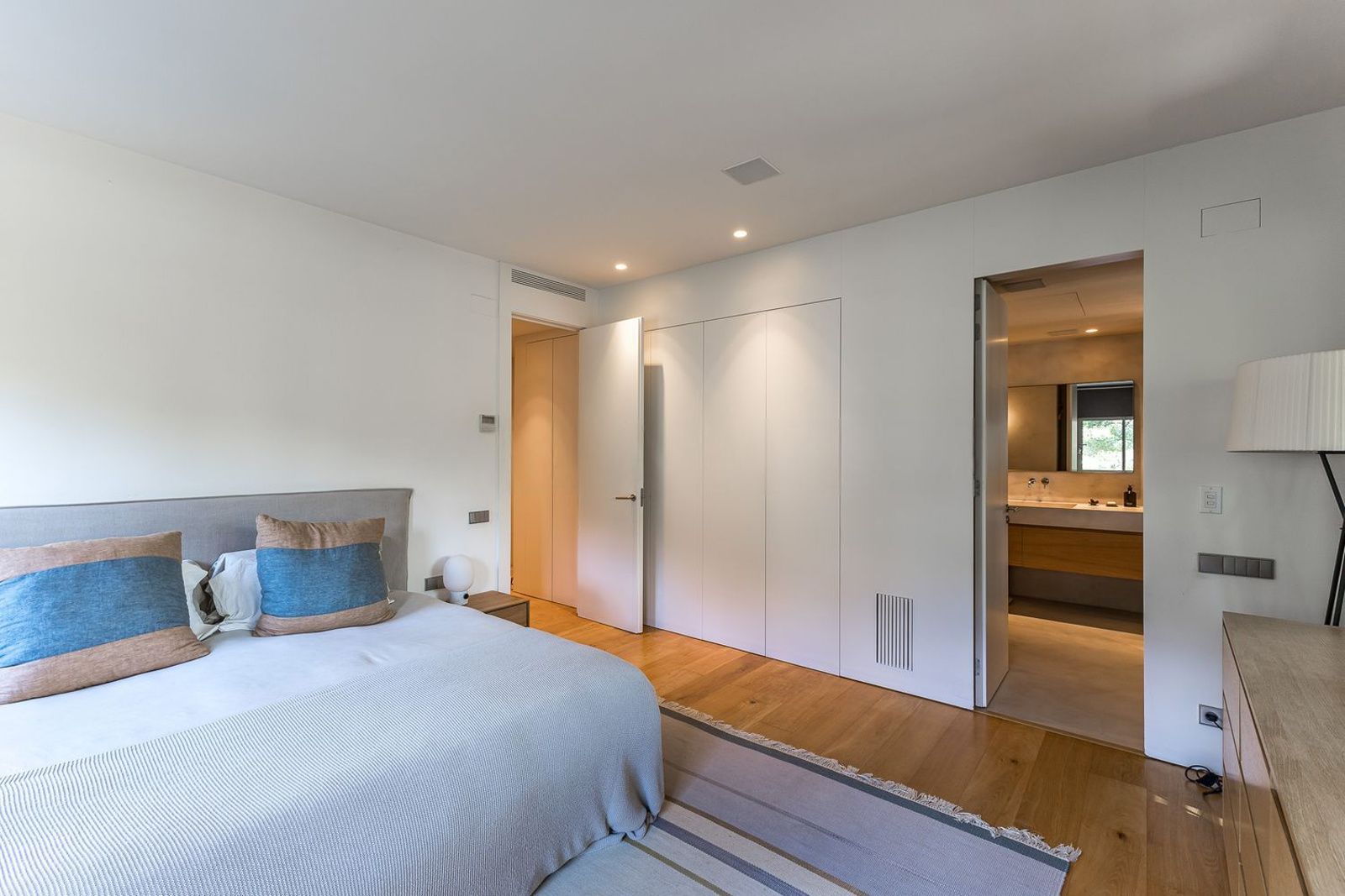 Soveromsdelen har tre romslige soverom. Hovedsuiten har eget bad og direkte tilgang til terrassen, mens de to andre soverommene vender mot Collserola og deler et andre bad. Eget vaskerom gir ekstra praktisk komfort.