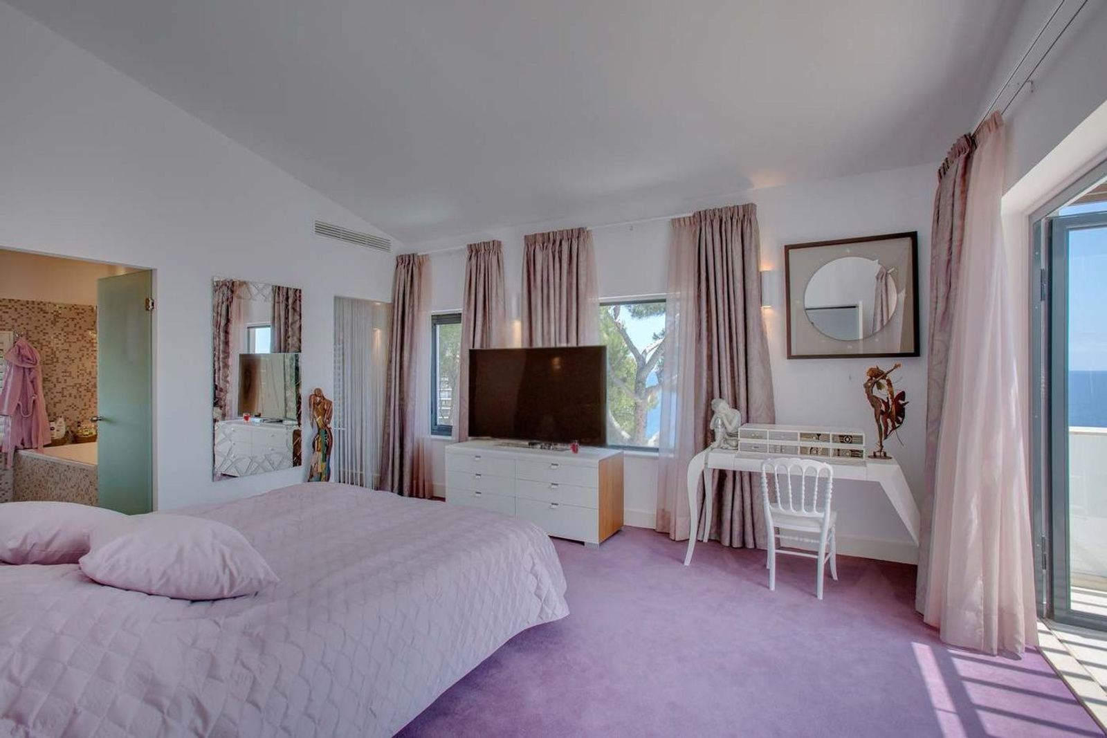 Hovedsuiten ligger i øverste etasje og tilbyr et privat og elegant rom med eget bad, jacuzzi og direkte tilgang til en terrasse med fantastisk havutsikt. De øvrige soverommene ligger i etasjen over og deler et ekstra bad.