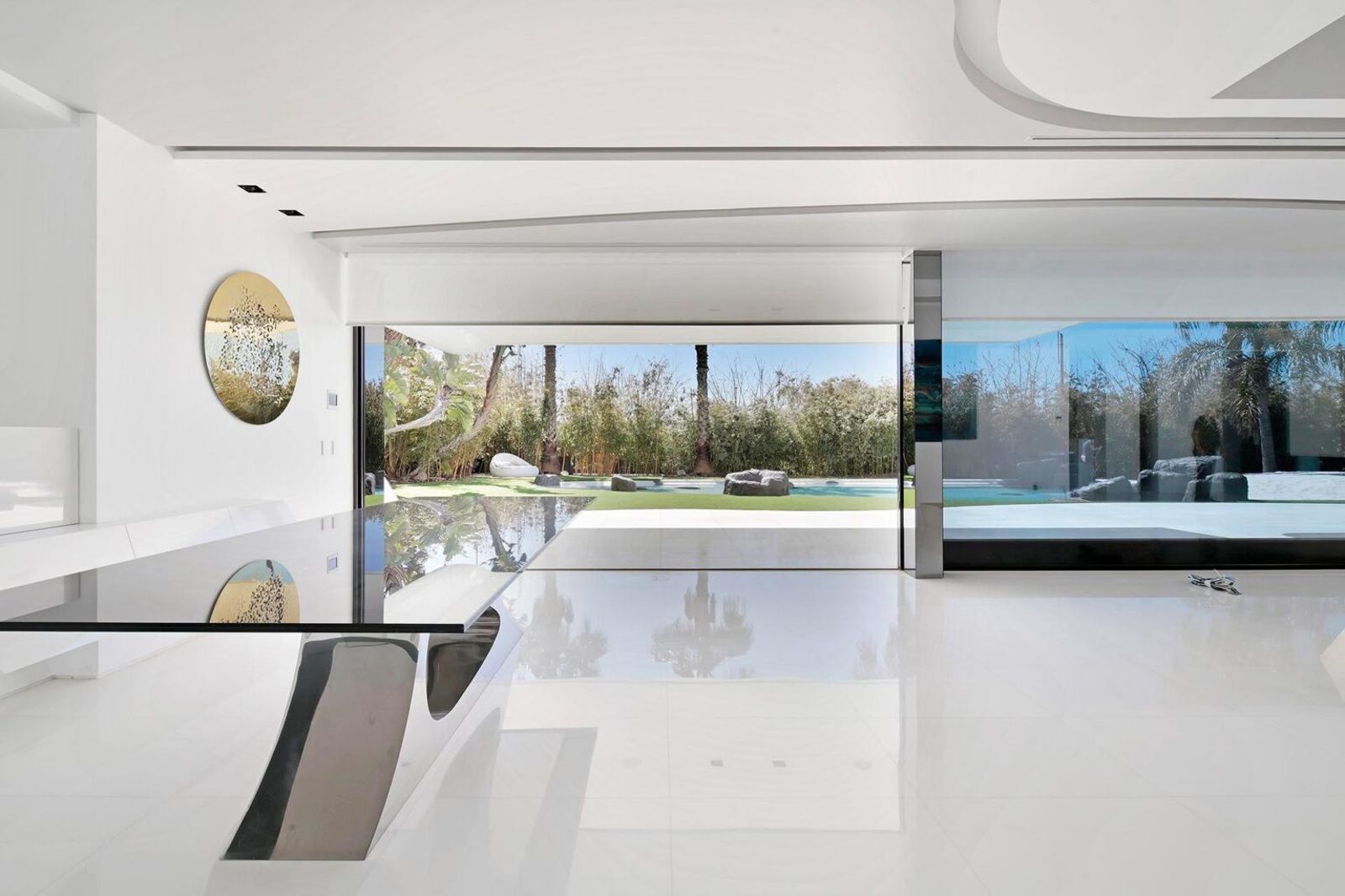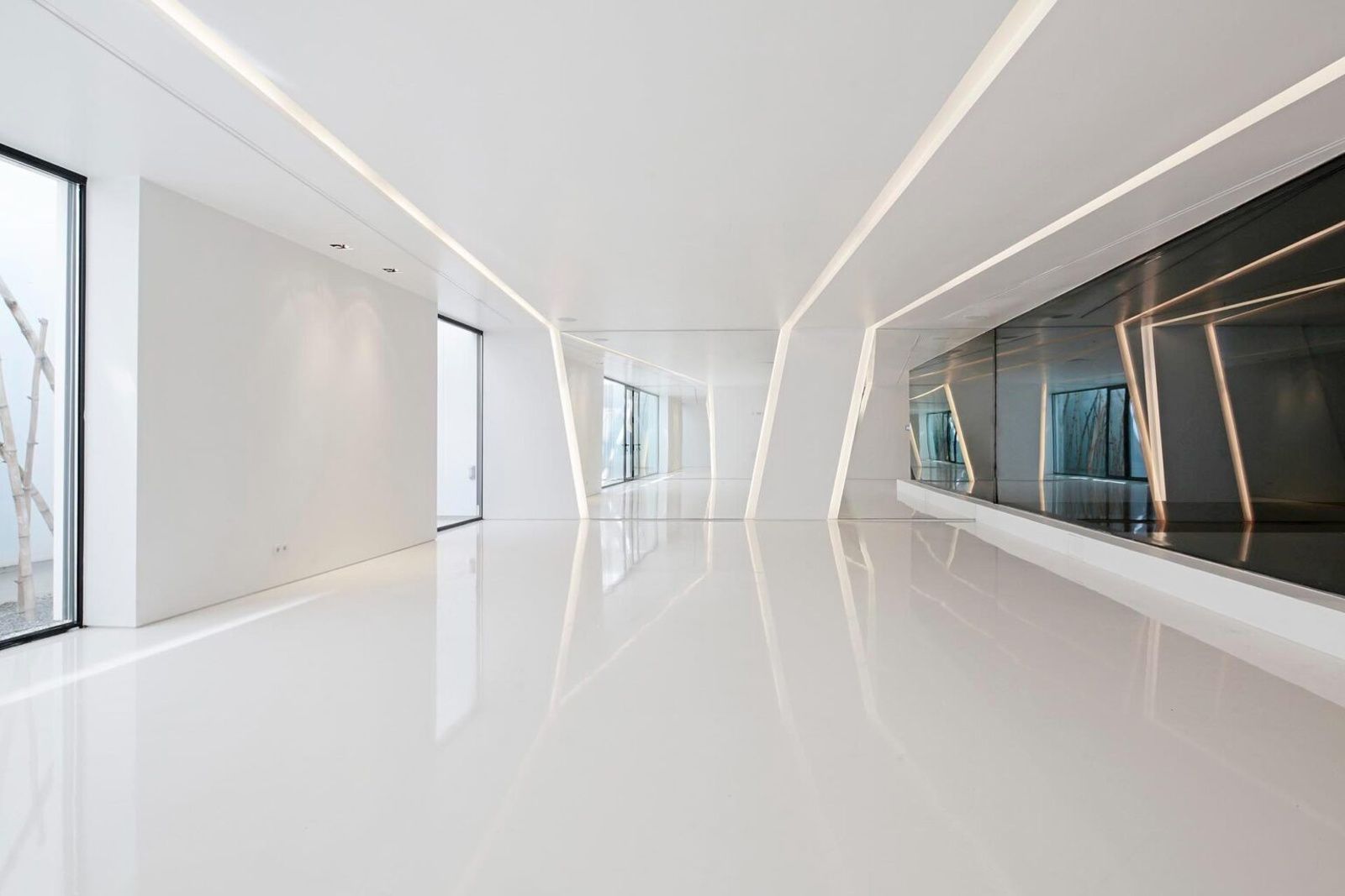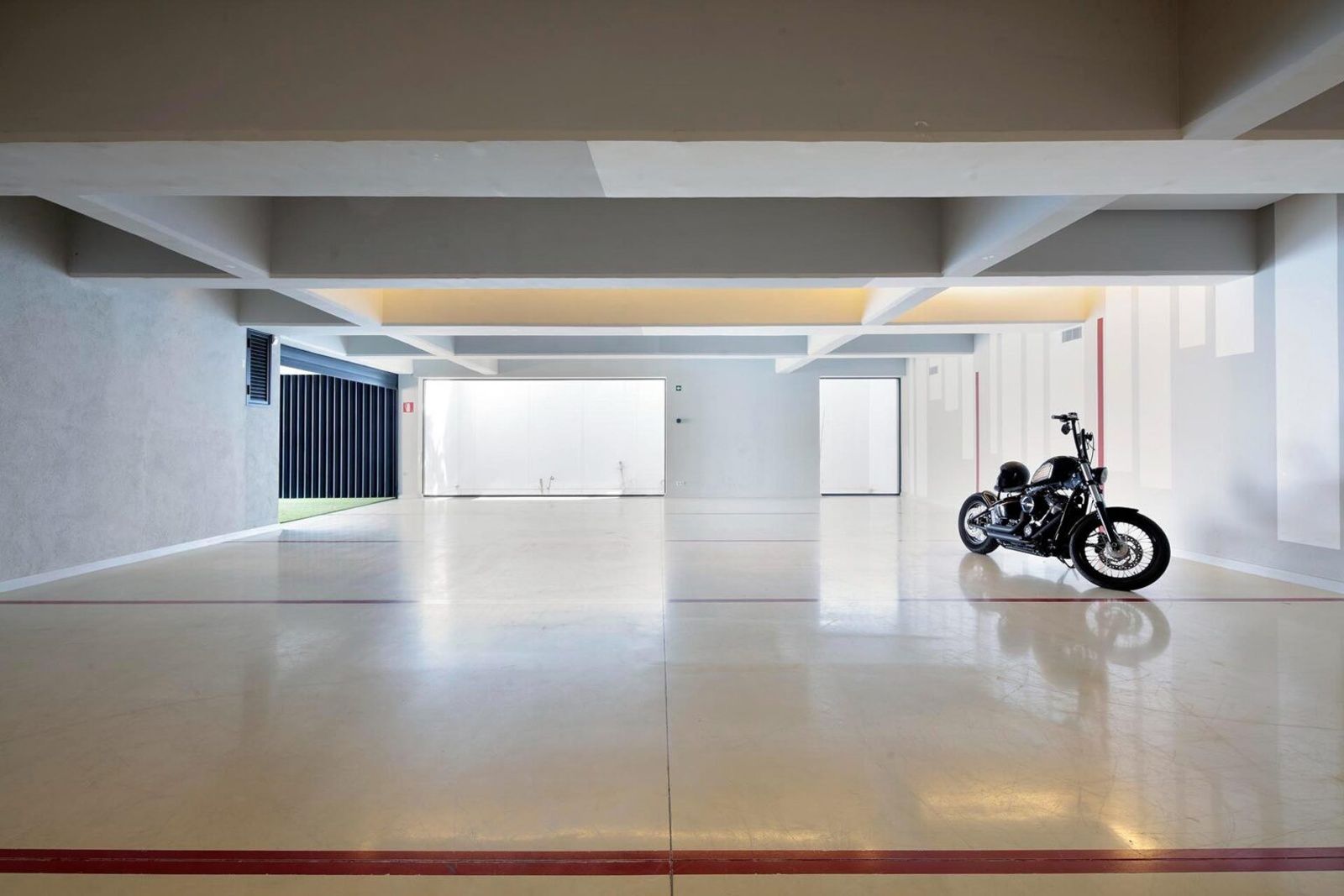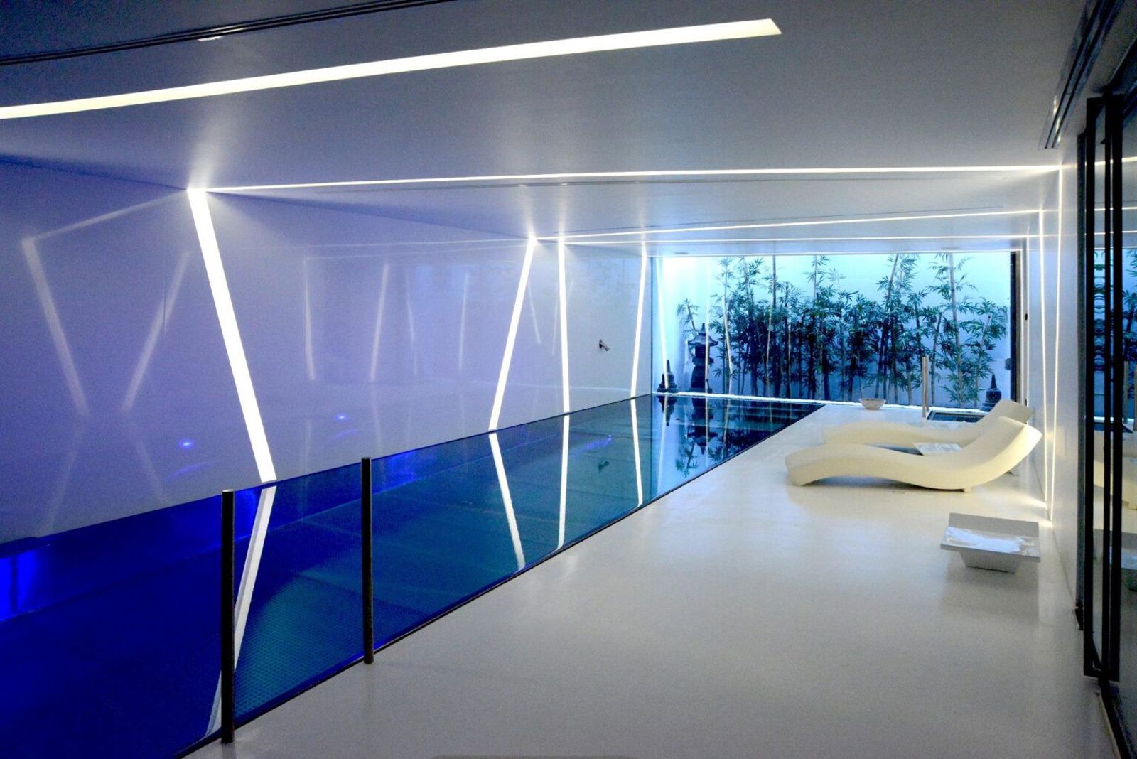 De nederste etasjene huser et eksklusivt velværeområde med spa, badstue, treningsrom og et innendørs svømmebasseng i rustfritt stål, i tillegg til privat kino, serviceområde og garasje for opptil ti biler. Villaen har KNX-smarthussystem, gulvvarme og arkitektonisk belysning fra Viabizzuno.
