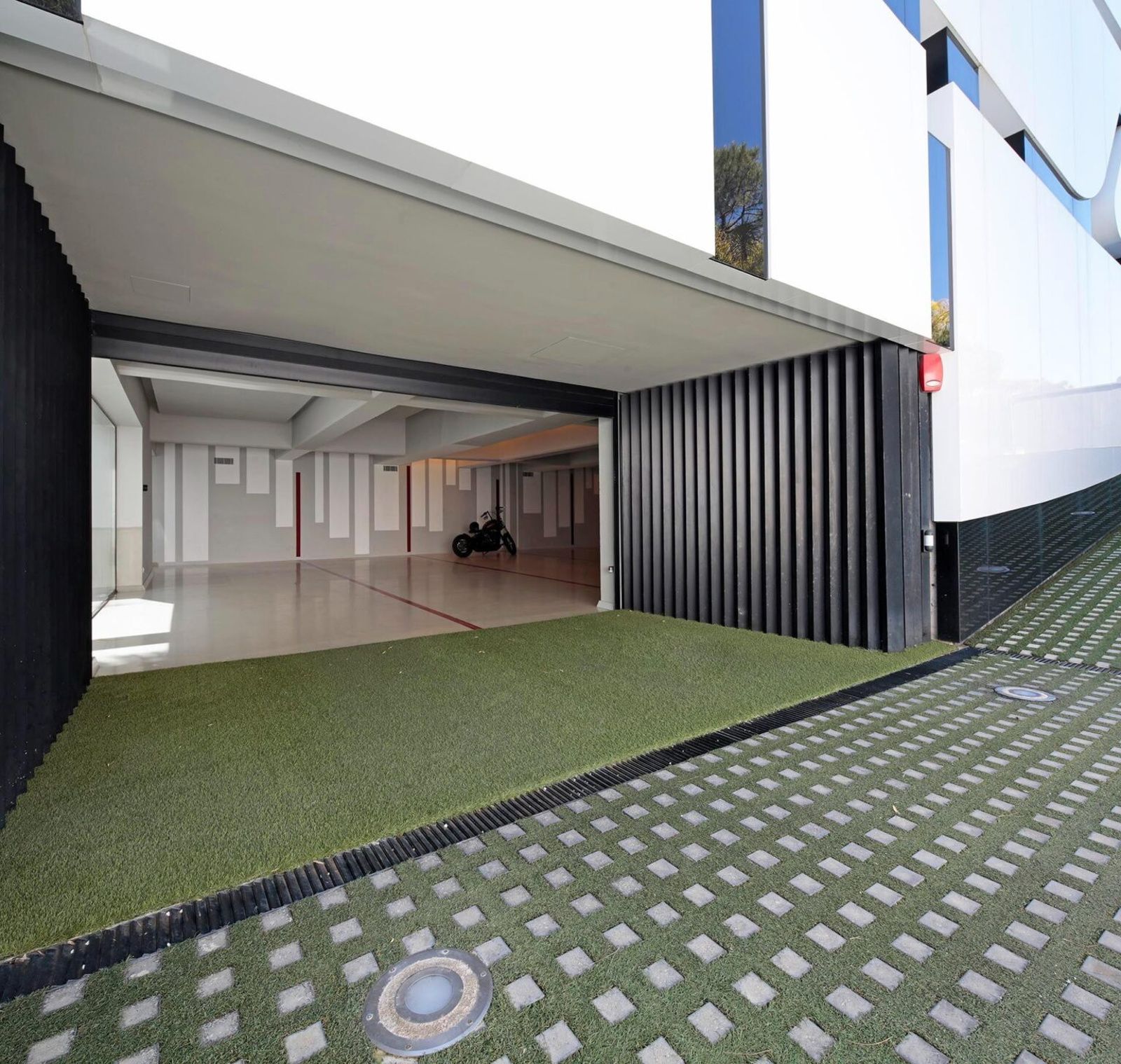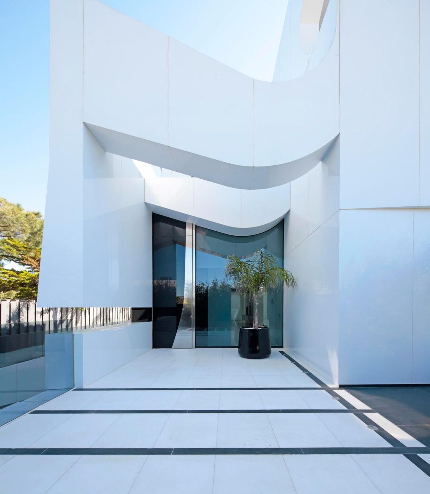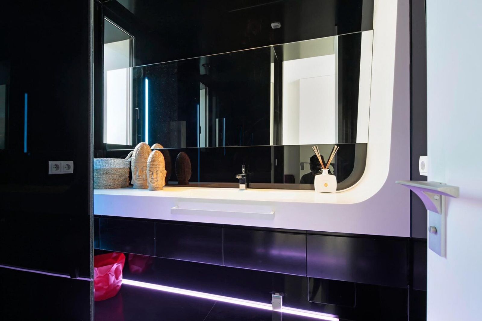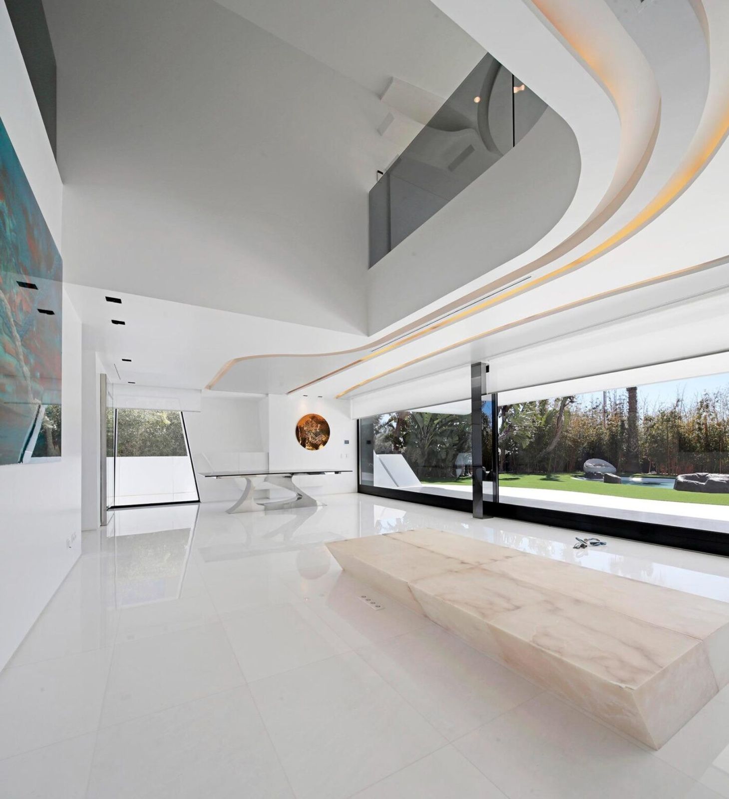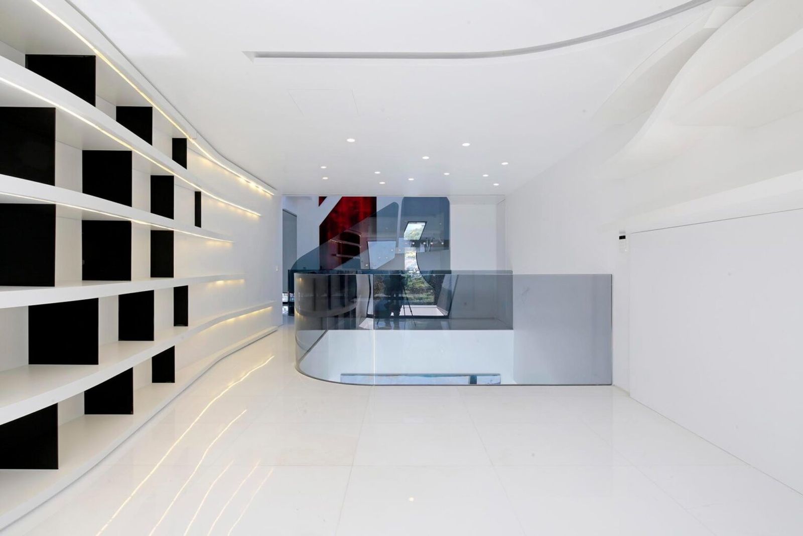 De nederste etasjene huser et eksklusivt velværeområde med spa, badstue, treningsrom og et innendørs svømmebasseng i rustfritt stål, i tillegg til privat kino, serviceområde og garasje for opptil ti biler. Villaen har KNX-smarthussystem, gulvvarme og arkitektonisk belysning fra Viabizzuno.