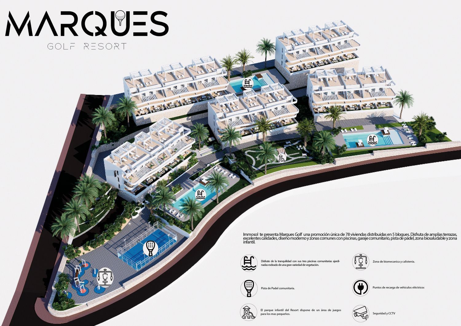Fellesområdene inkluderer svømmebassenger med jacuzzi, treningsrom, paddlebane, barneområder og grønne hager.