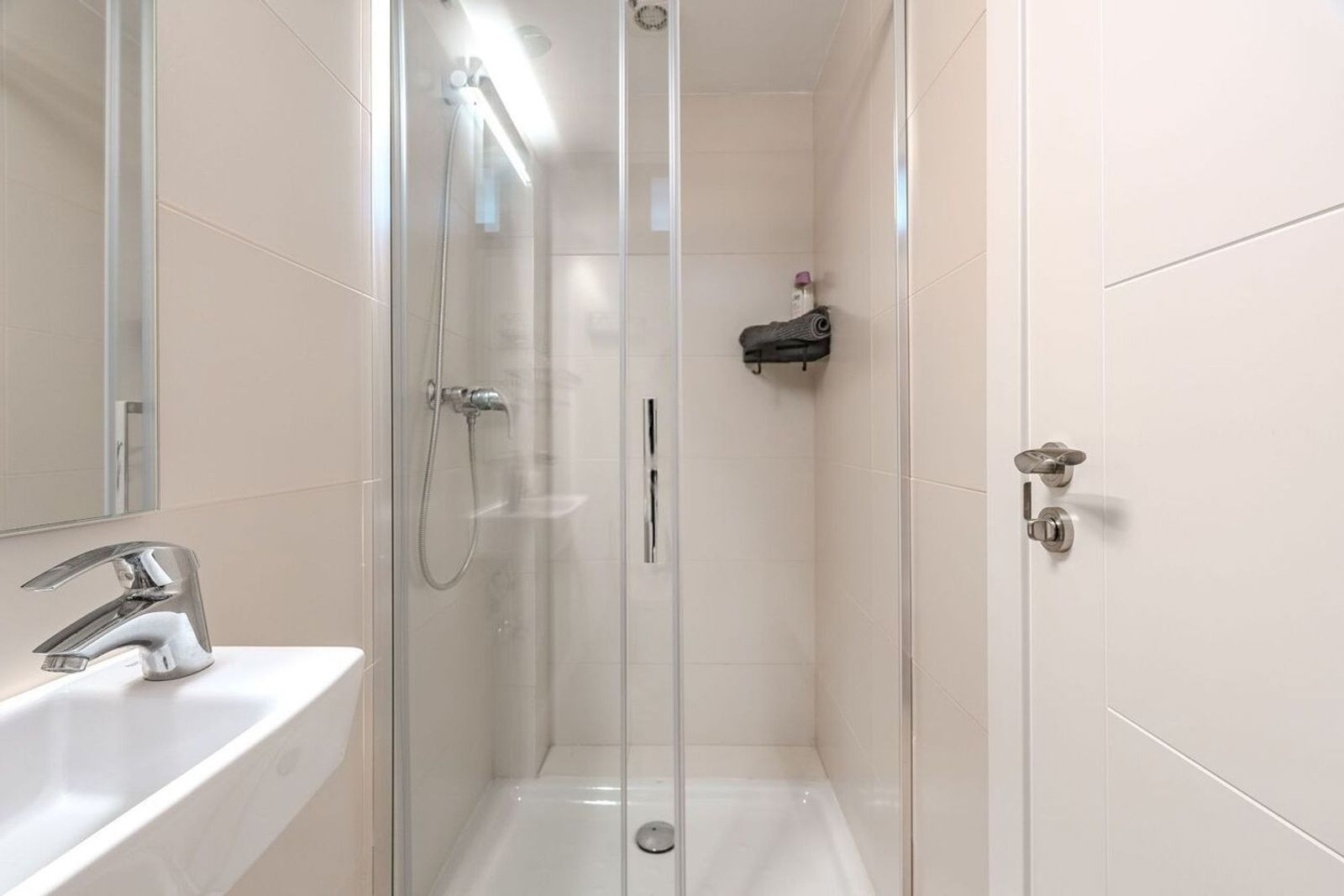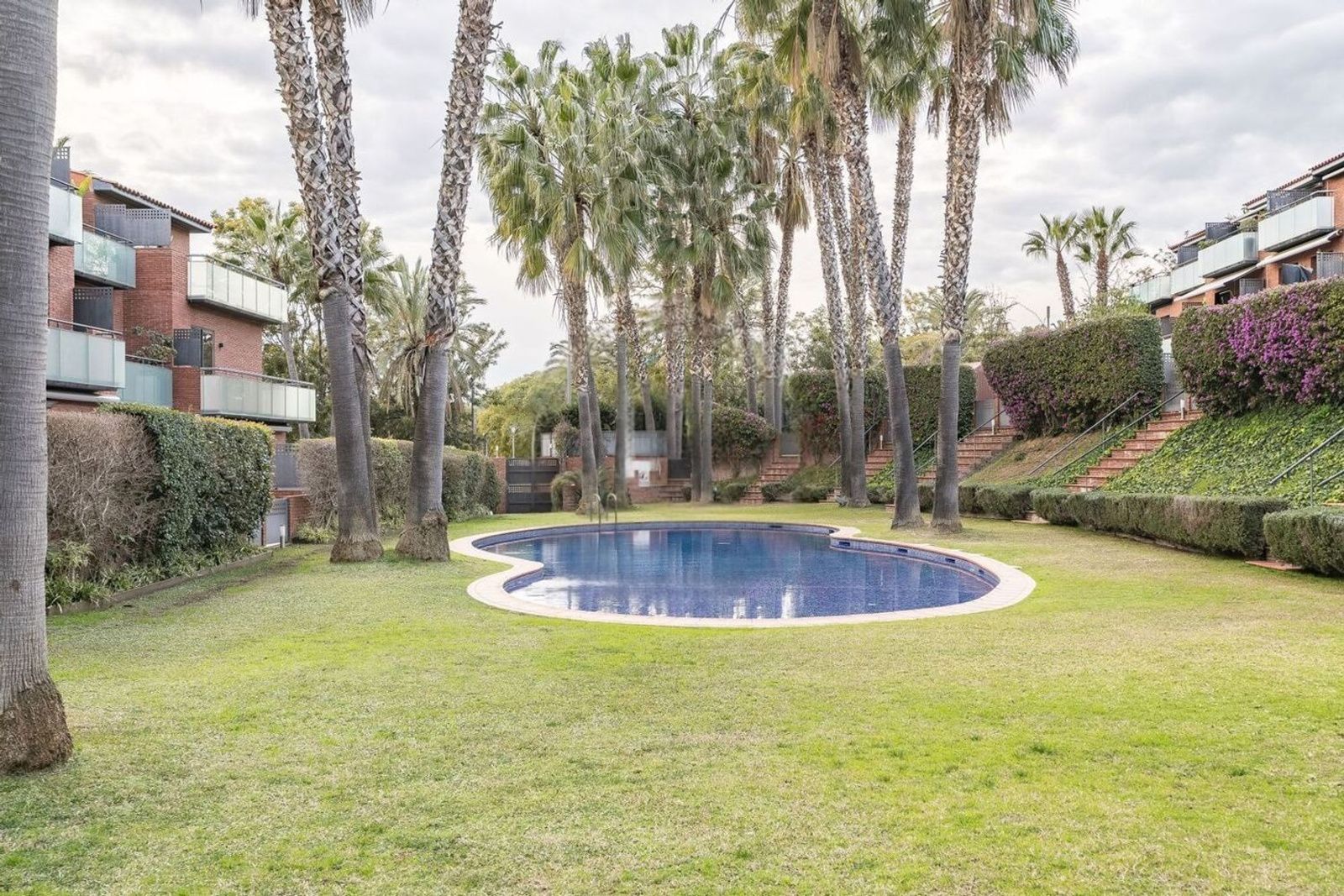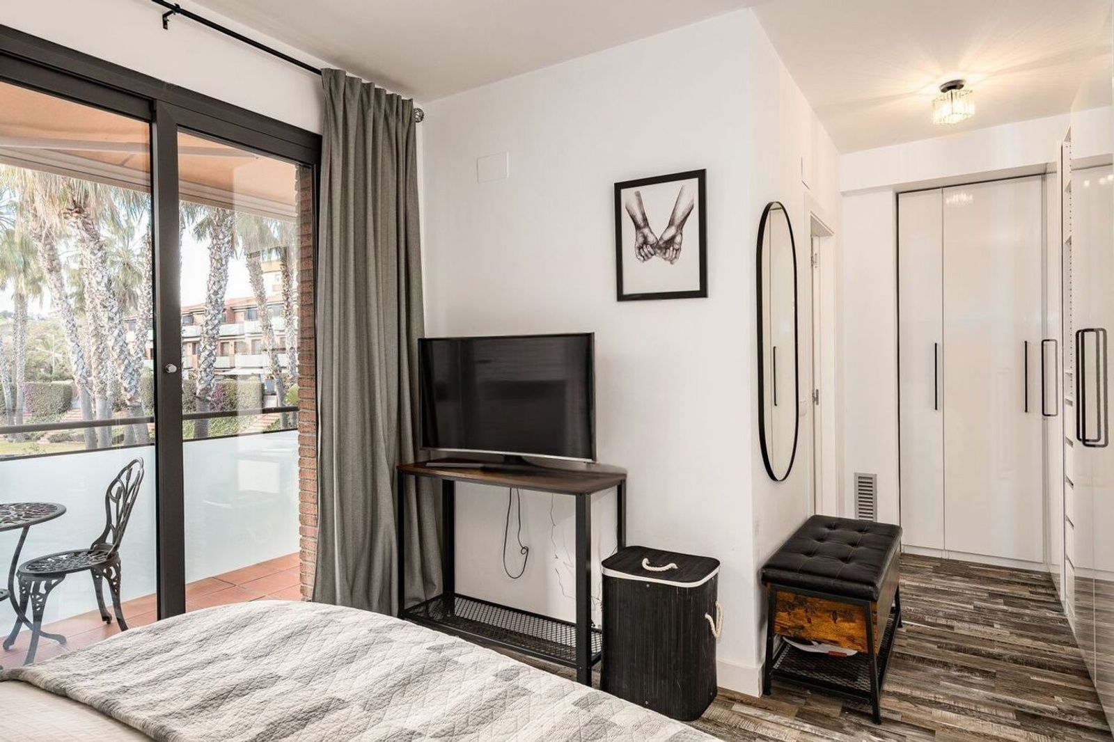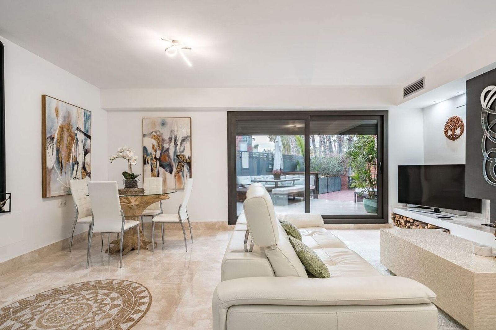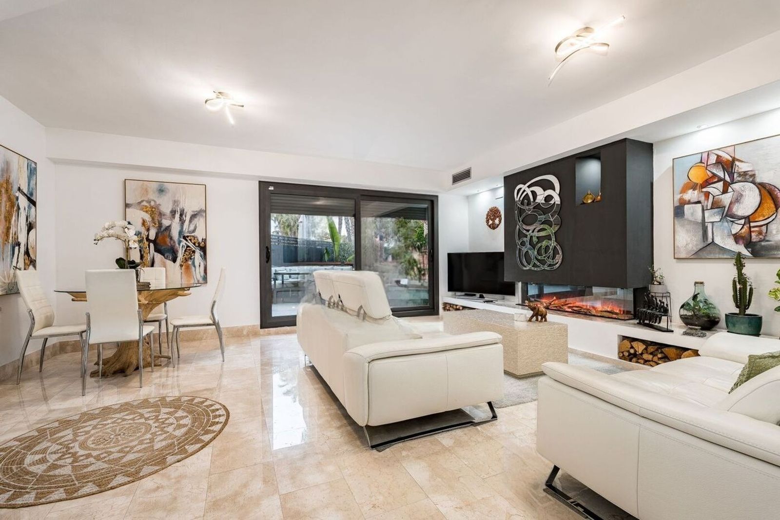 Stuen har tilgang til uteplass og felles basseng med hage. Åpen kjøkkenløsning med glassvegger.